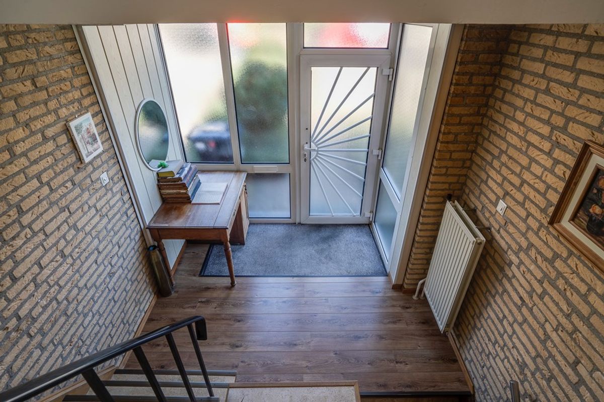 De tussenverdieping biedt volop leefcomfort en is praktisch ingedeeld. Je vindt hier twee nette slaapkamers, een ruime badkamer met ligbad, inloopdouche, wastafelmeubel en tweede toilet, en een aparte wasruimte met derde toilet, wastafel en aansluitingen voor wasmachine en droger. Vanuit de hal op deze tussenverdieping heb je directe toegang tot de inpandige garage, wat zorgt voor extra gemak en opbergruimte.