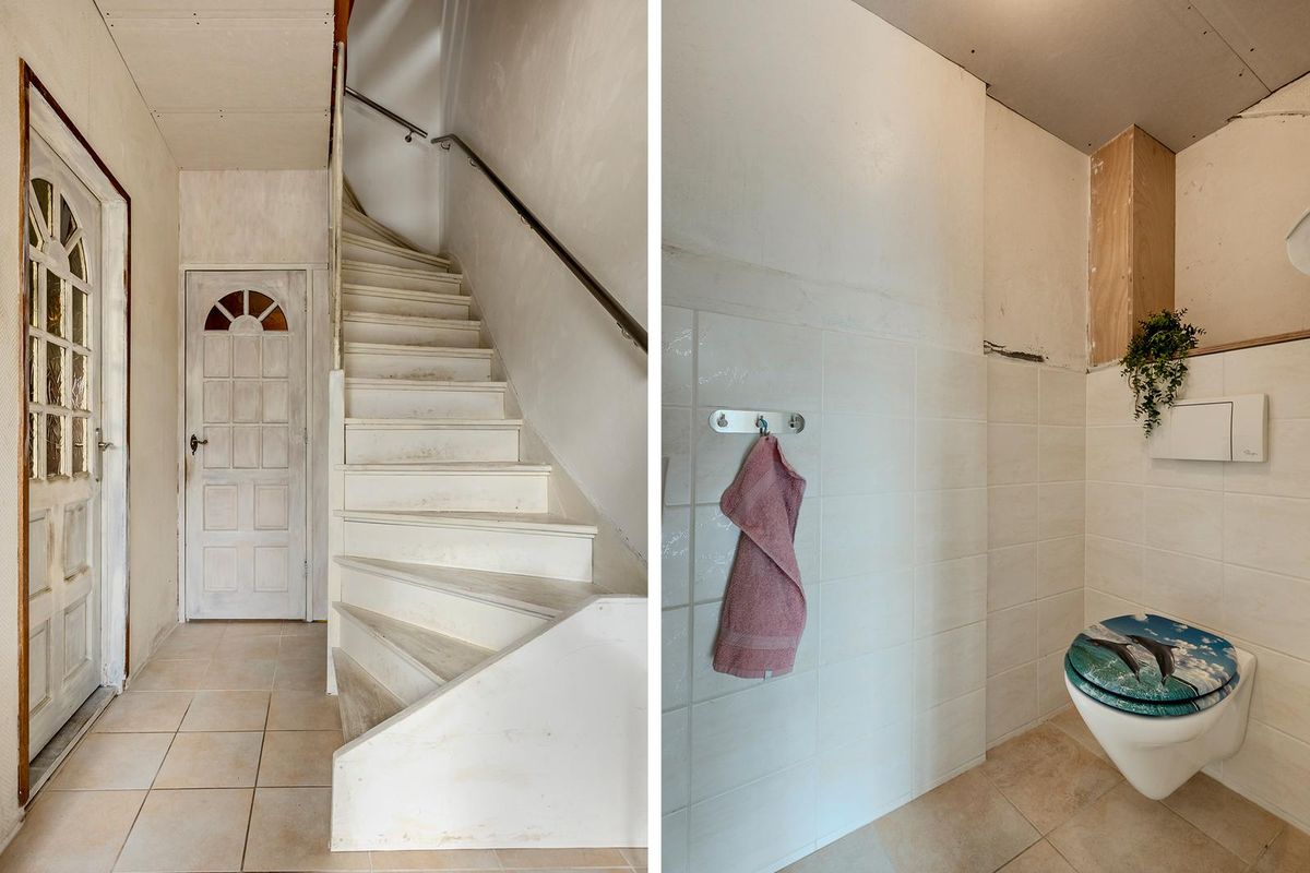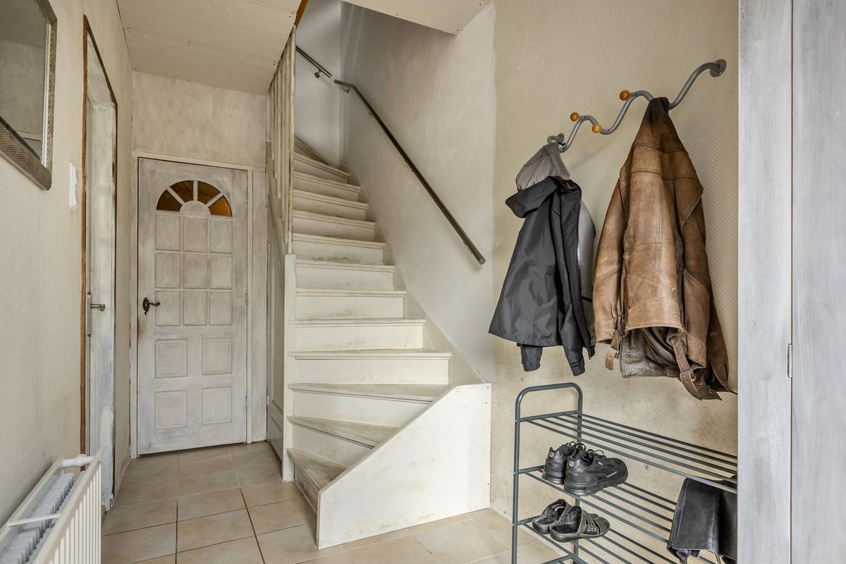 In de hal met tegelvloer vindt u de meterkast, trapkast, toilet en trap naar de 1e verdieping.