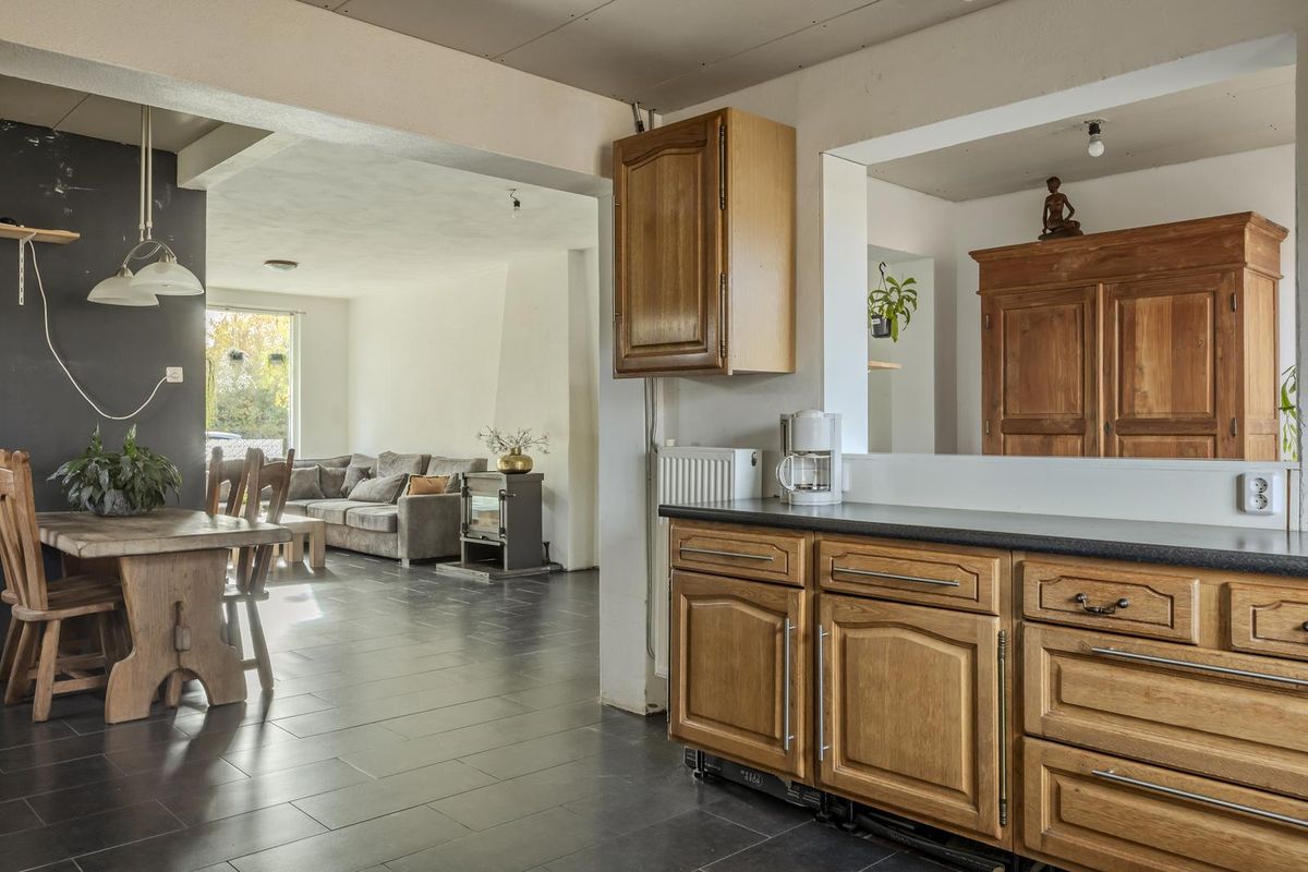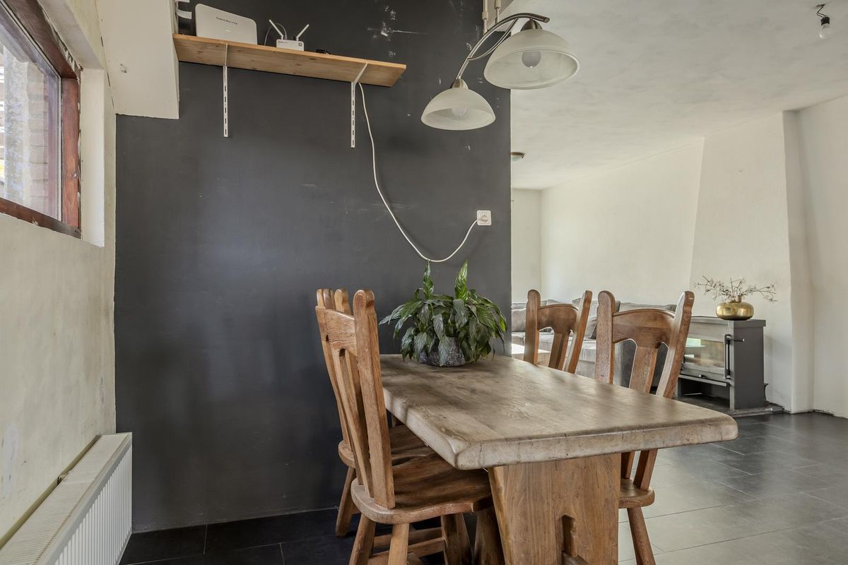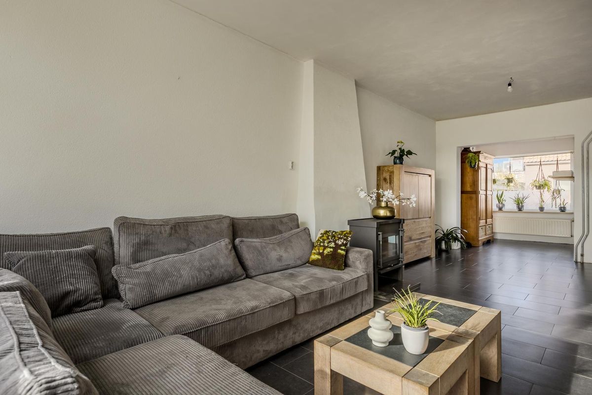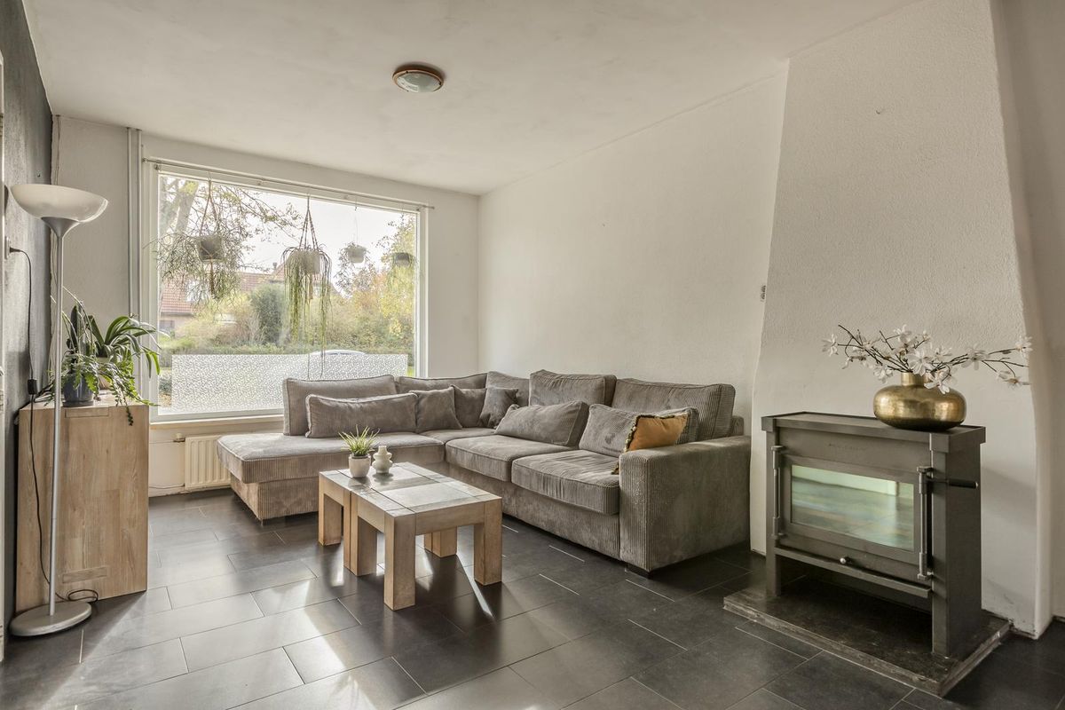 Vanuit de hal komt u in de woonkamer met een tegelvloer en veel lichtinval door de raampartijen. In de woonkamer bevindt zich een sfeervolle houtkachel.