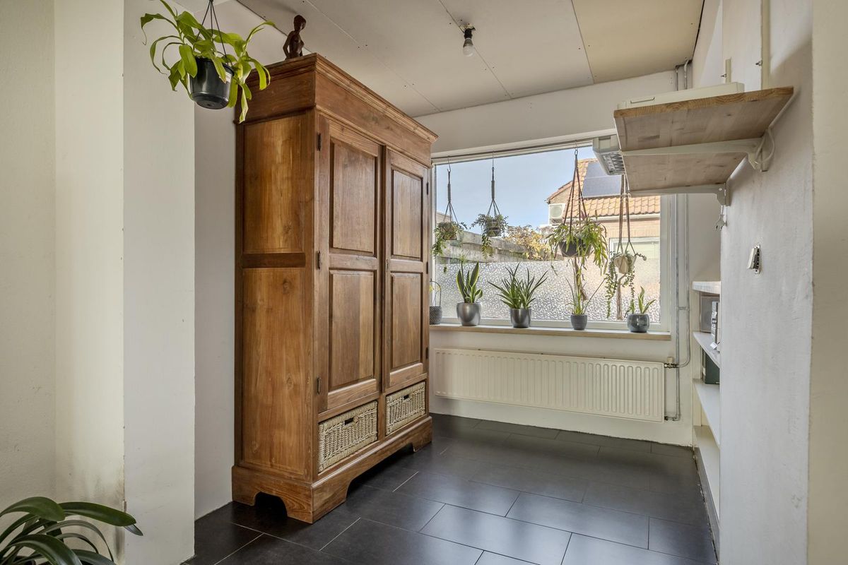 De bijkeuken met tegelvloer biedt plaats aan de opstelling voor de wasmachine en droger en cv installatie met boiler.