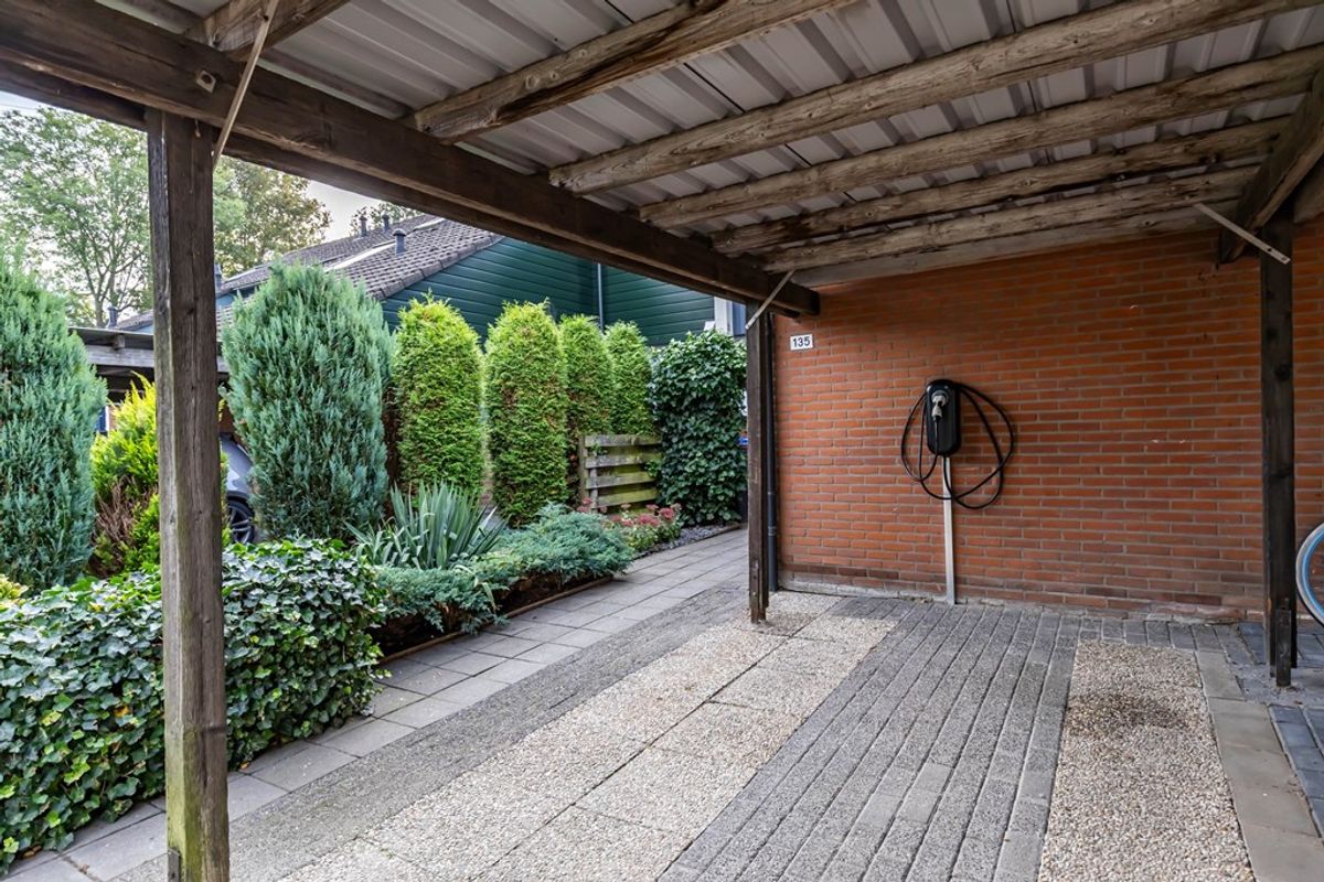eigen oprit met carport en aansluiting voor een laadpunt voor een EV. Geïsoleerde berging met deur naar de hal, entree, hal met luxe toilet en meterkast. Ruime, lichte woonkamer met recent geplaatste luxe keuken met inbouw apparatuur en tuingerichte zithoek. Tuin op het zuiden met een houten berging en achterom.