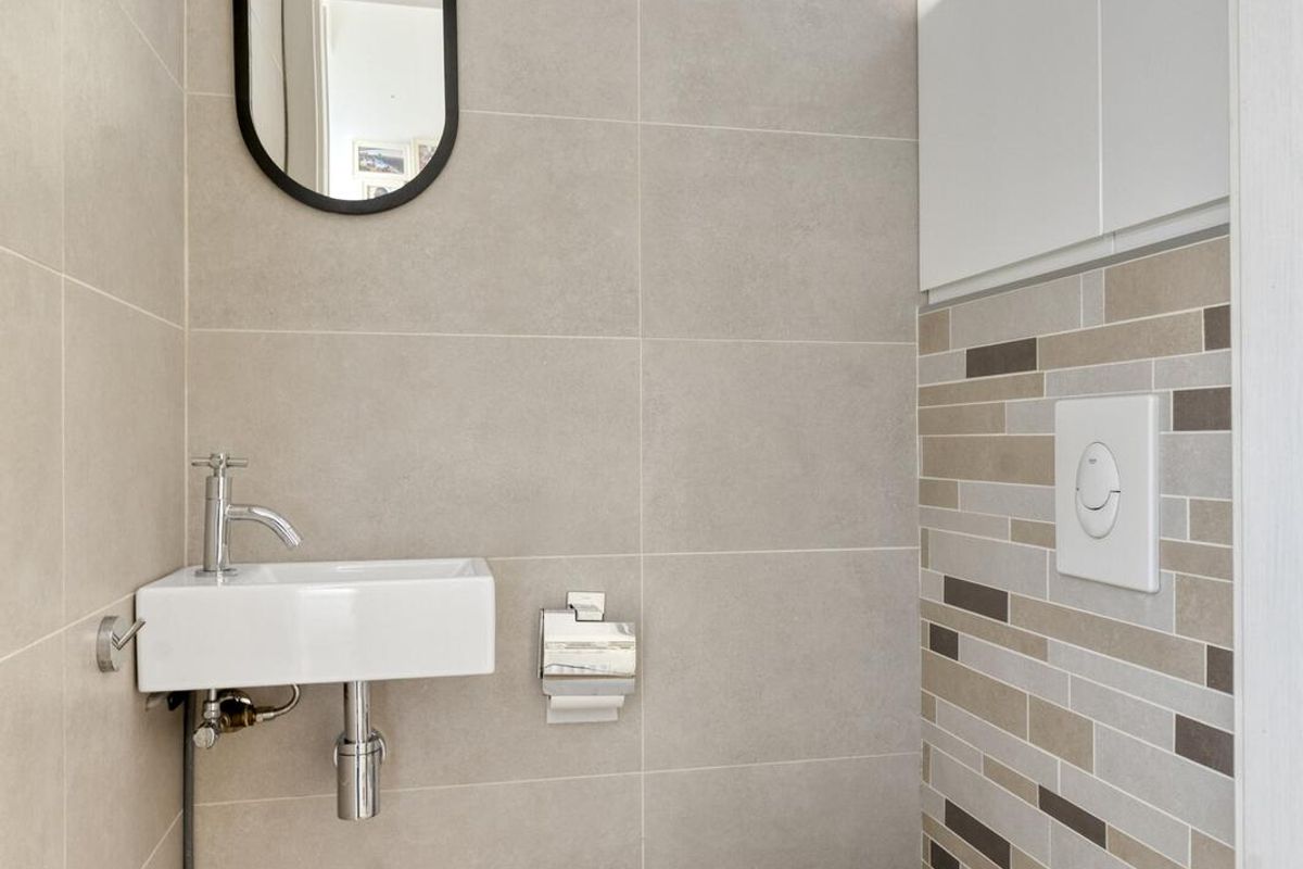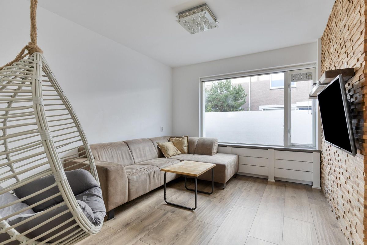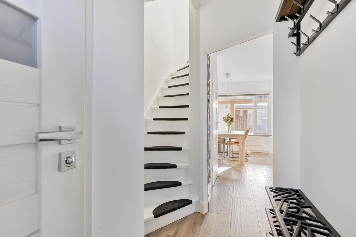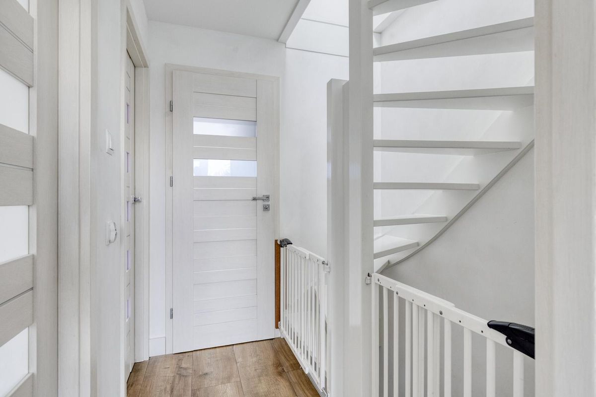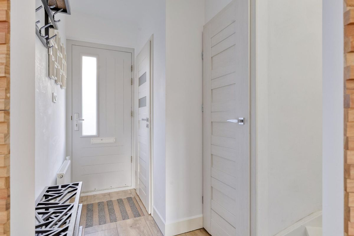 De woning wordt bereikt via een verzorgde voortuin, waar een overkapping boven de voordeur bewoners en gasten verwelkomt. In de lichte hal is direct de rustige sfeer voelbaar die kenmerkend is voor het hele huis. Vanuit de hal heb je toegang tot de woonkamer, het moderne toilet en de trap naar de eerste verdieping.