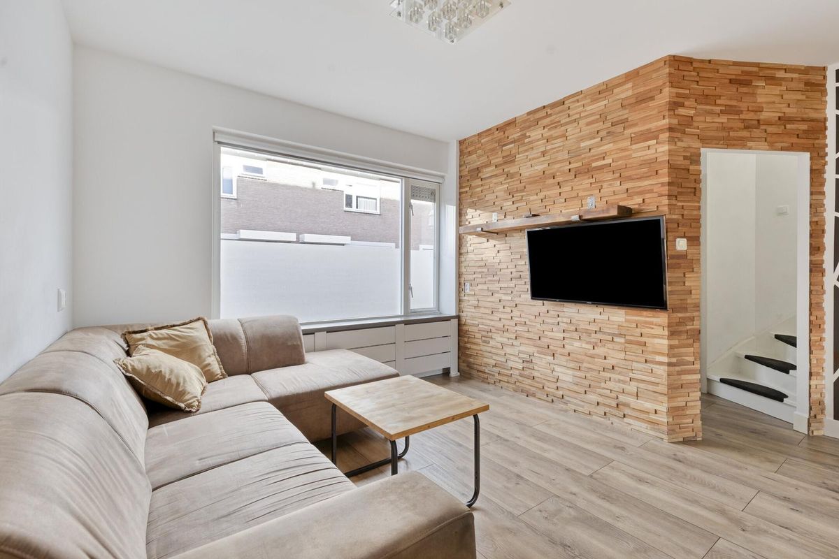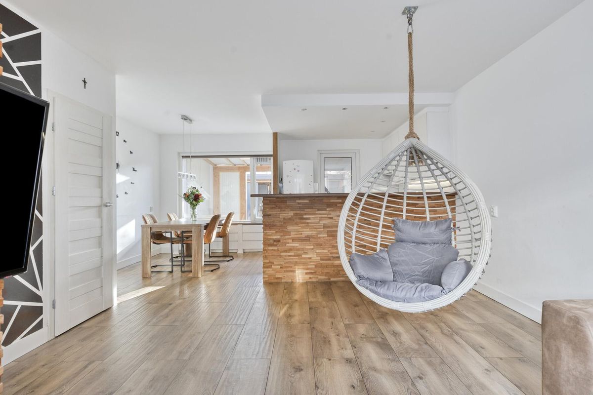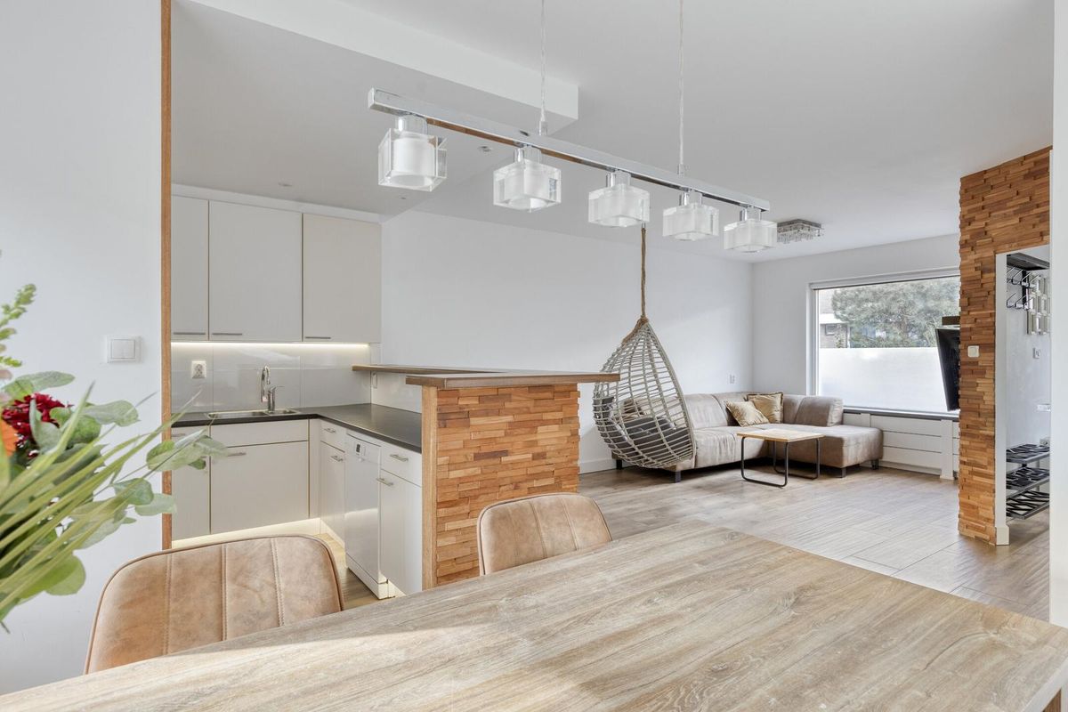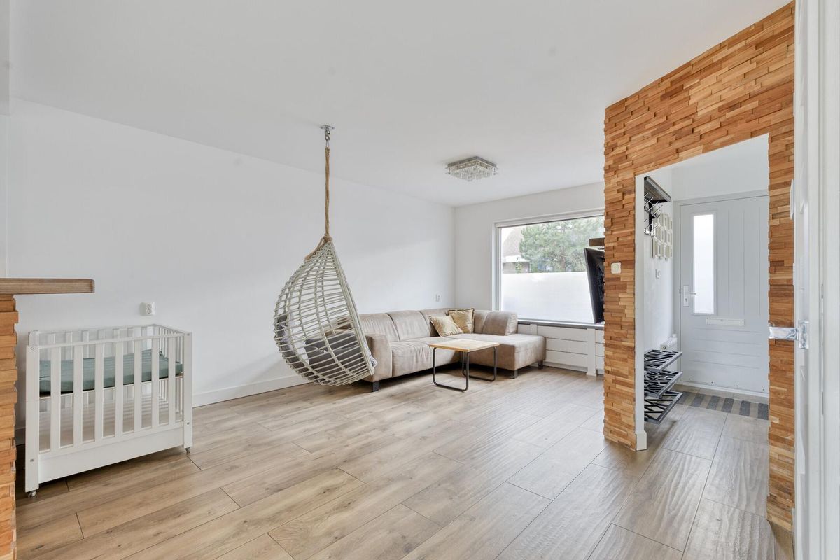 De woonkamer is ruim en licht dankzij de grote ramen. De tegelvloer met houtlook en de gladde wanden en plafonds geven het interieur een moderne en warme uitstraling. De woonkamer loopt naadloos over in het eetgedeelte en de halfopen keuken, waardoor een grote leefruimte ontstaat. Via de keuken heb je toegang tot de achtertuin met overkapping.