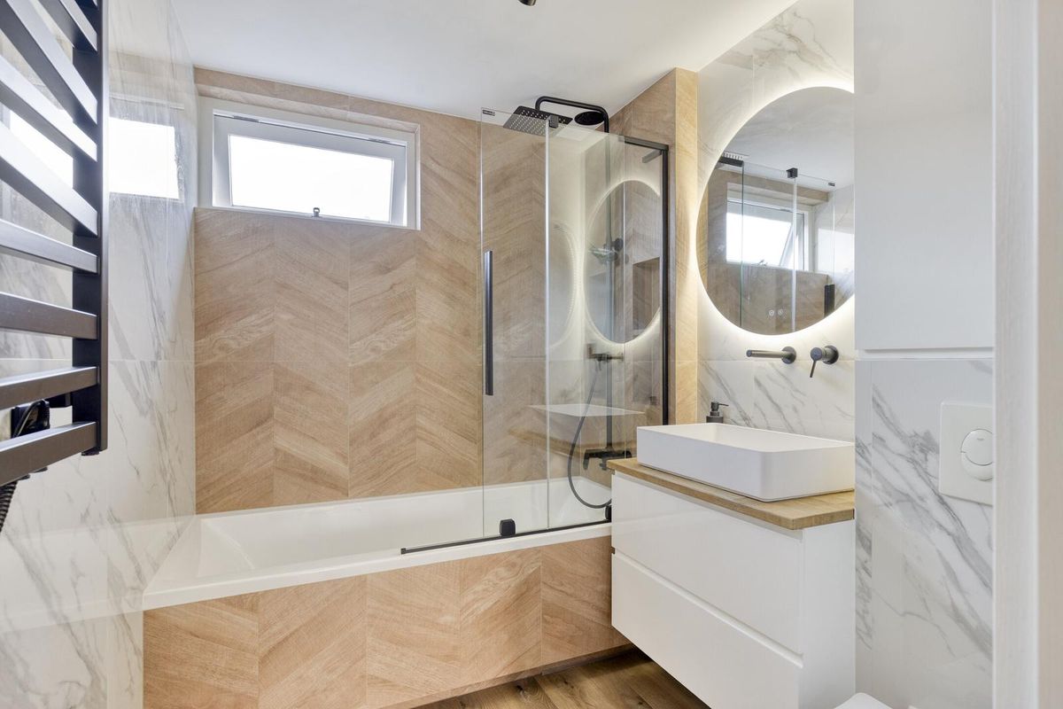 De badkamer is modern en stijlvol afgewerkt en uitgerust met een bad, een meubel met wastafel, toilet, zwarte regendouche, zwarte designradiator en een ronde verlichte spiegel. De marmerlook tegels in combinatie met lichte wanden en zwarte accenten creëren een luxe en aangename ruimte.