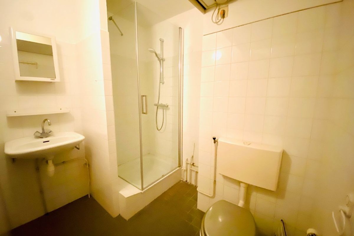 De badkamer is volledig betegeld en voorzien van een wastafel met spiegel, douche, toilet en wasmachine-aansluiting.