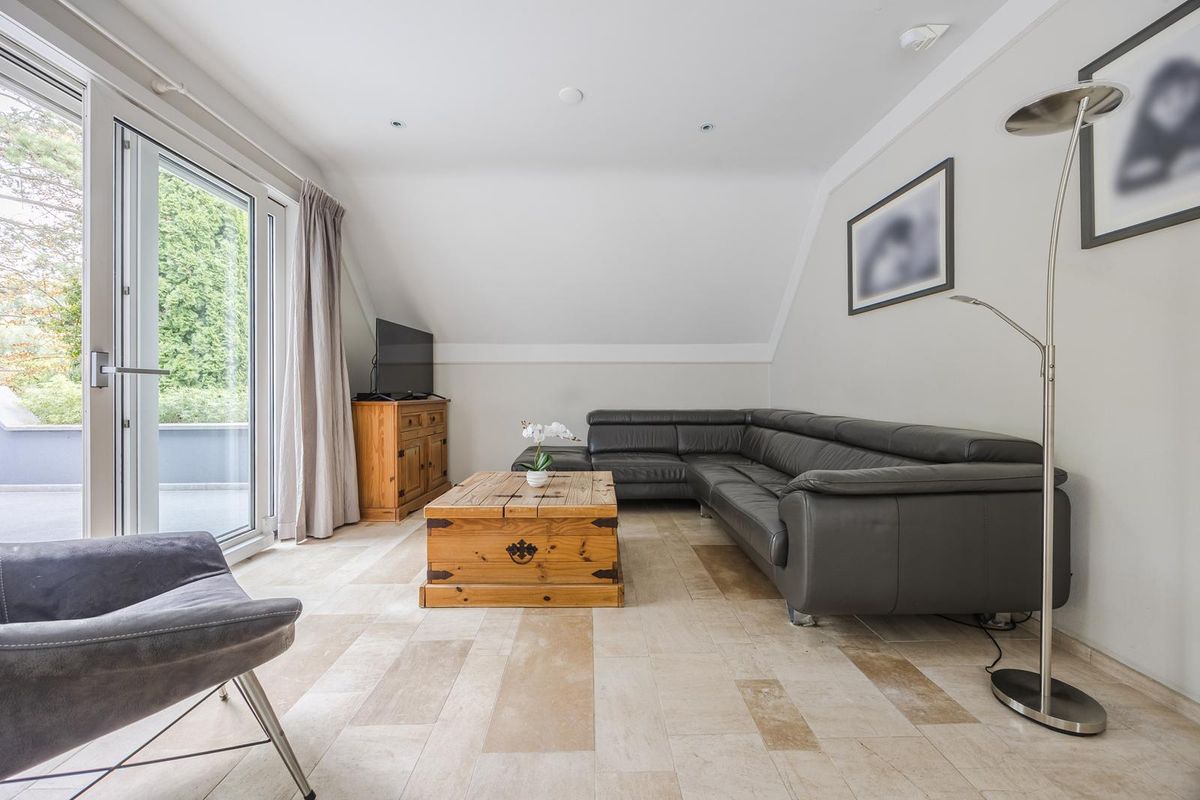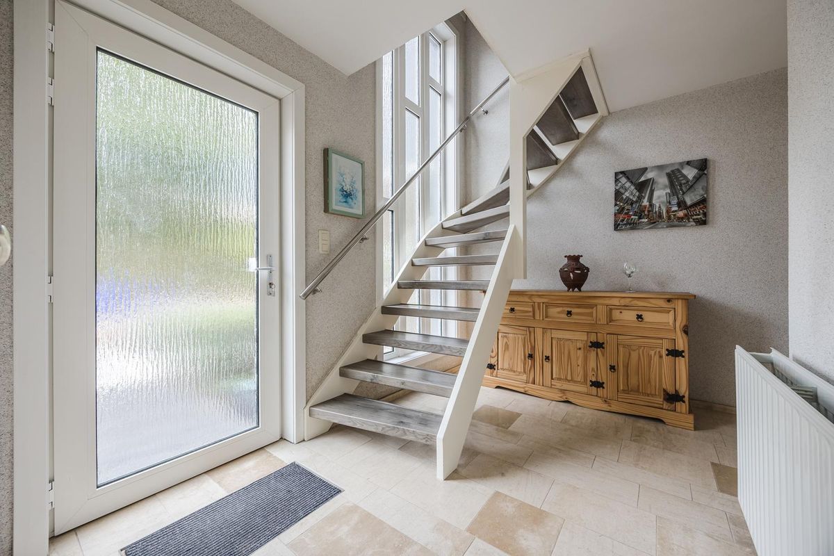Via de trap met sfeervolle vide komt u op de 1e verdieping. De overloop met Travertin tegelvloer en vloerverwarming biedt toegang tot de woonkamer, slaapkamer, badkamer en het toilet.