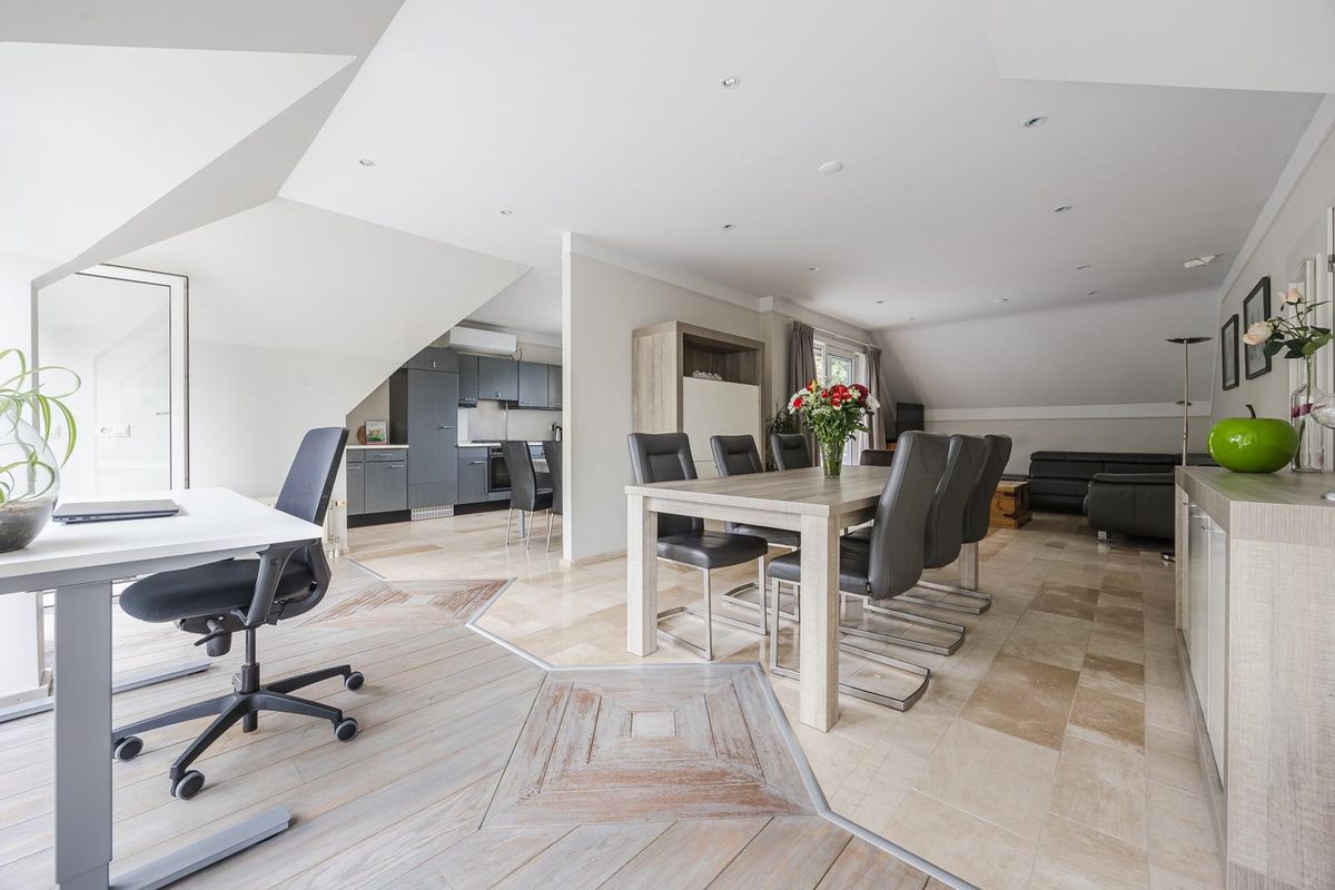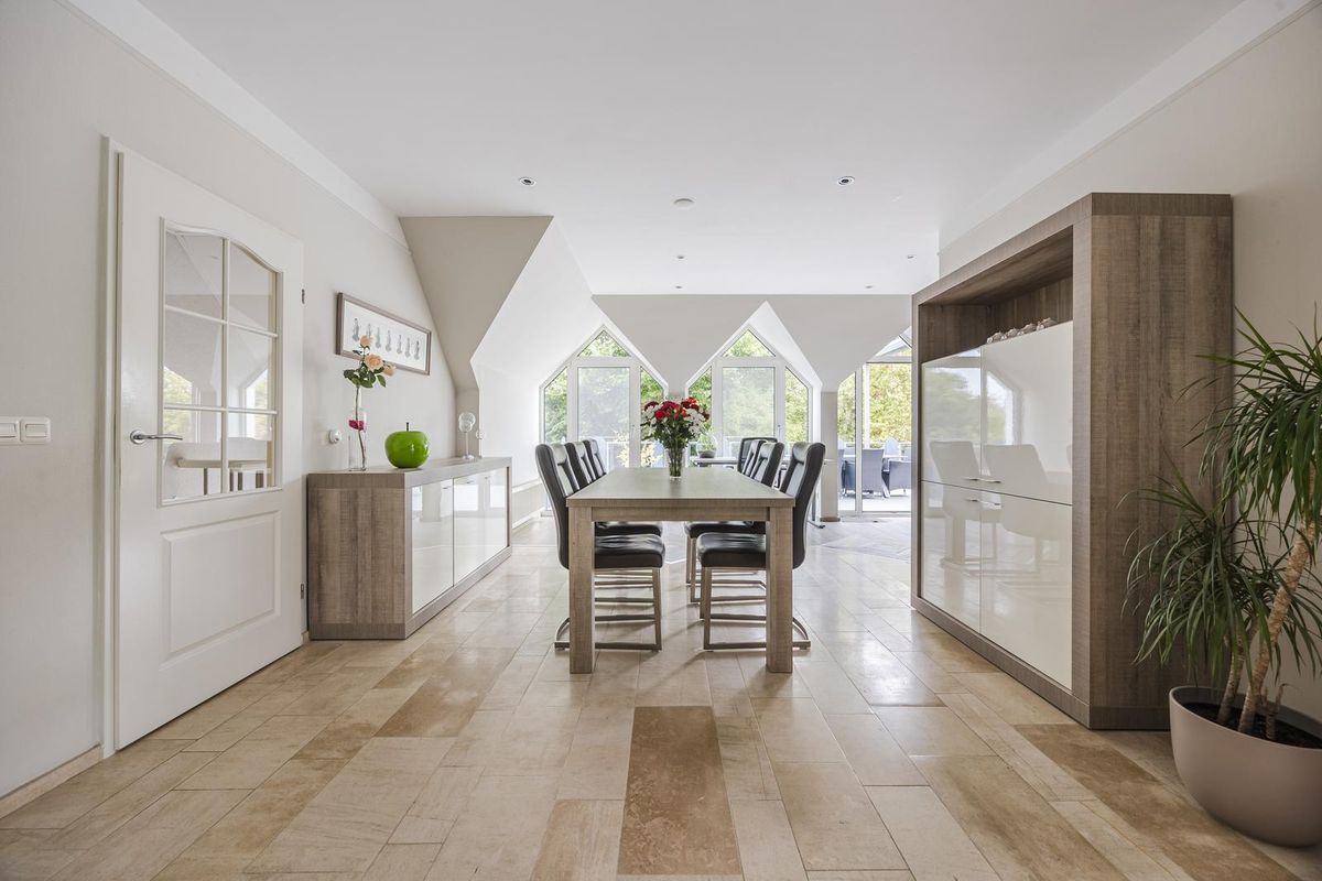 De heerlijk ruime woonkamer is voorzien van een Travertin tegelvloer, vloerverwarming, gestuct plafond en biedt veel lichtinval door de grote raampartijen. Vanuit de woonkamer heeft u direct toegang tot het grote dakterras door de schuifpui of één van de drie deuren in de bijzonder vormgegeven raampartijen.