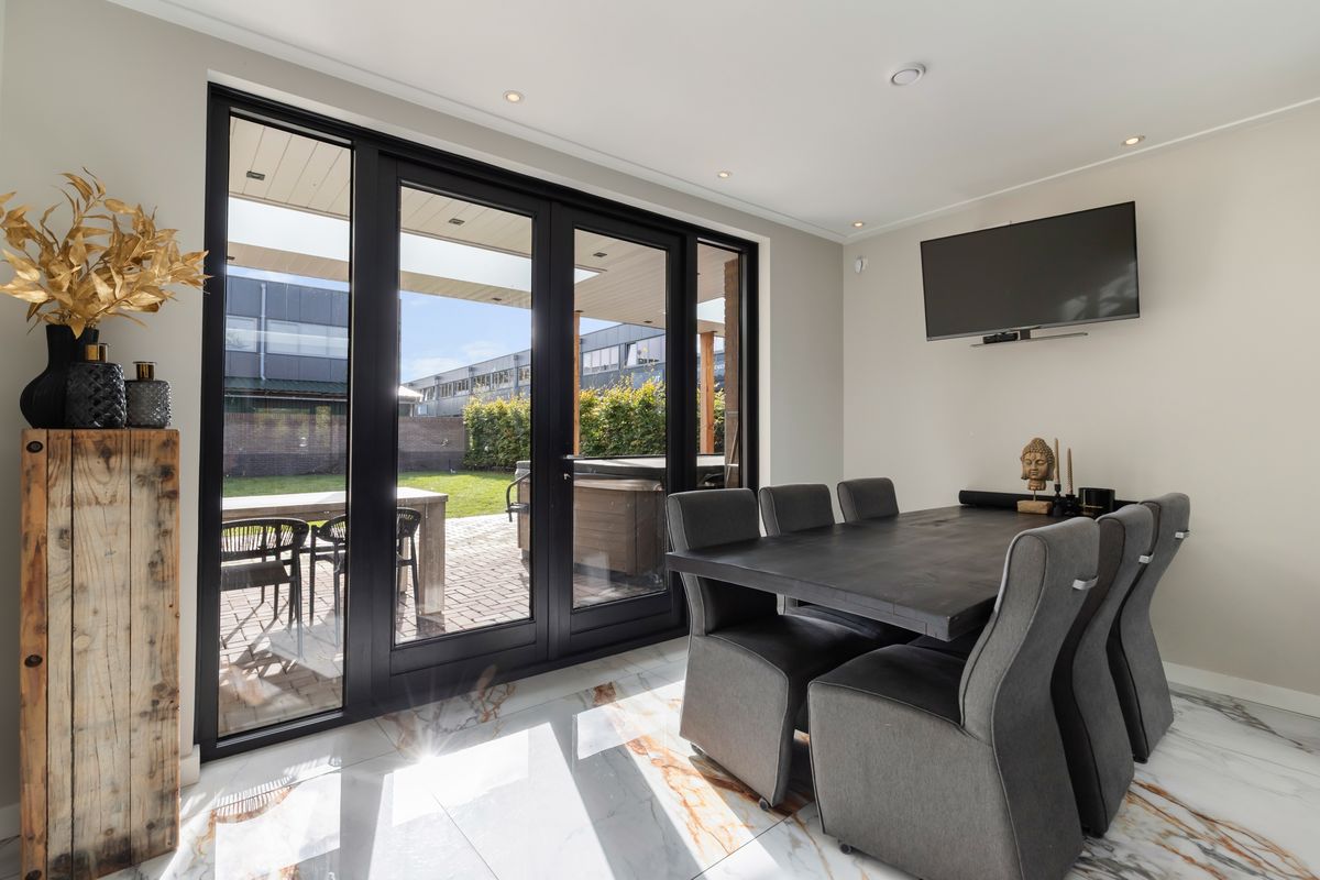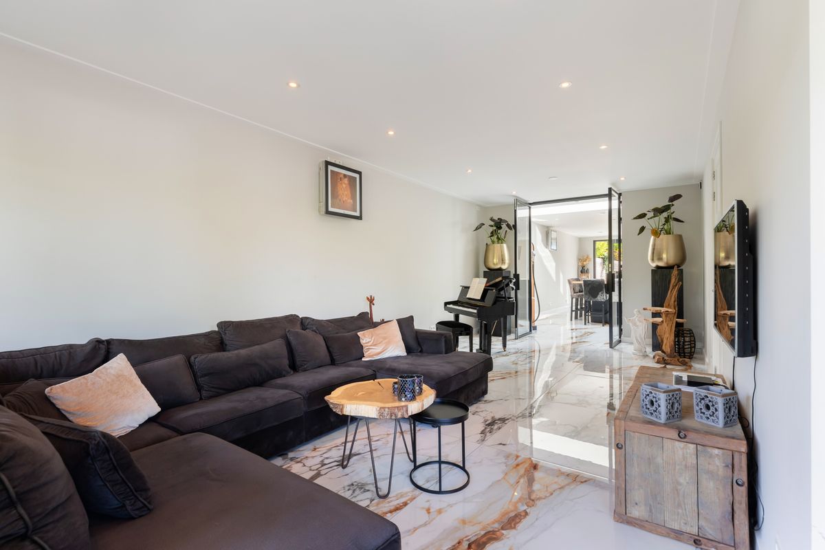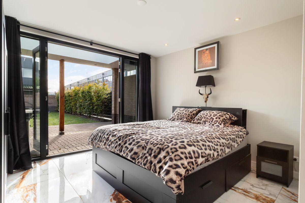 De royale entree aan de zijkant van het huis geeft toegang tot de woonkamer en wasruimte. De lichte en ruime woonkamer met erker is voorzien van een rustige werkhoek. Aan de achterkant van de woning bevindt zich de volledig nieuwe uitbouw met luxe woonkeuken. Vanuit de woonkeuken is de centrale hal te bereiken met apart toilet en doorgang naar de slaapkamer. De openslaande deuren in de woonkamer en slaapkamer bieden toegang tot de royale achtertuin met overkapping.