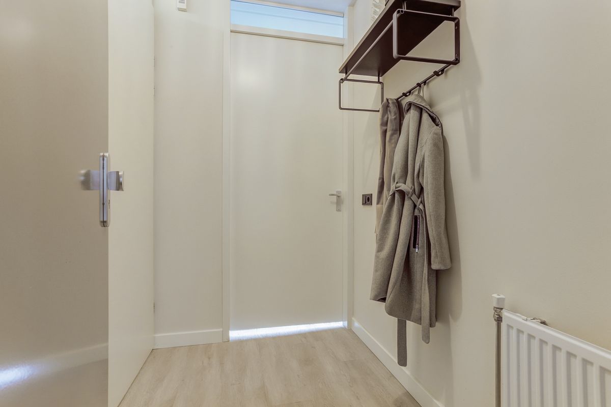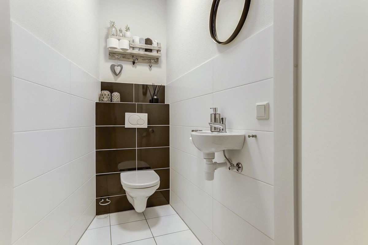 Bij binnenkomst in de hal tref je een nette ruimte die voldoende plek biedt voor een garderobe en toegang tot de woonkamer en het halfhoog betegelde toilet voorzien van hangcloset en fonteintje. De hal is voorzien van een pvc-vloer en strak gestuukte wanden en een spuitwerk plafond.