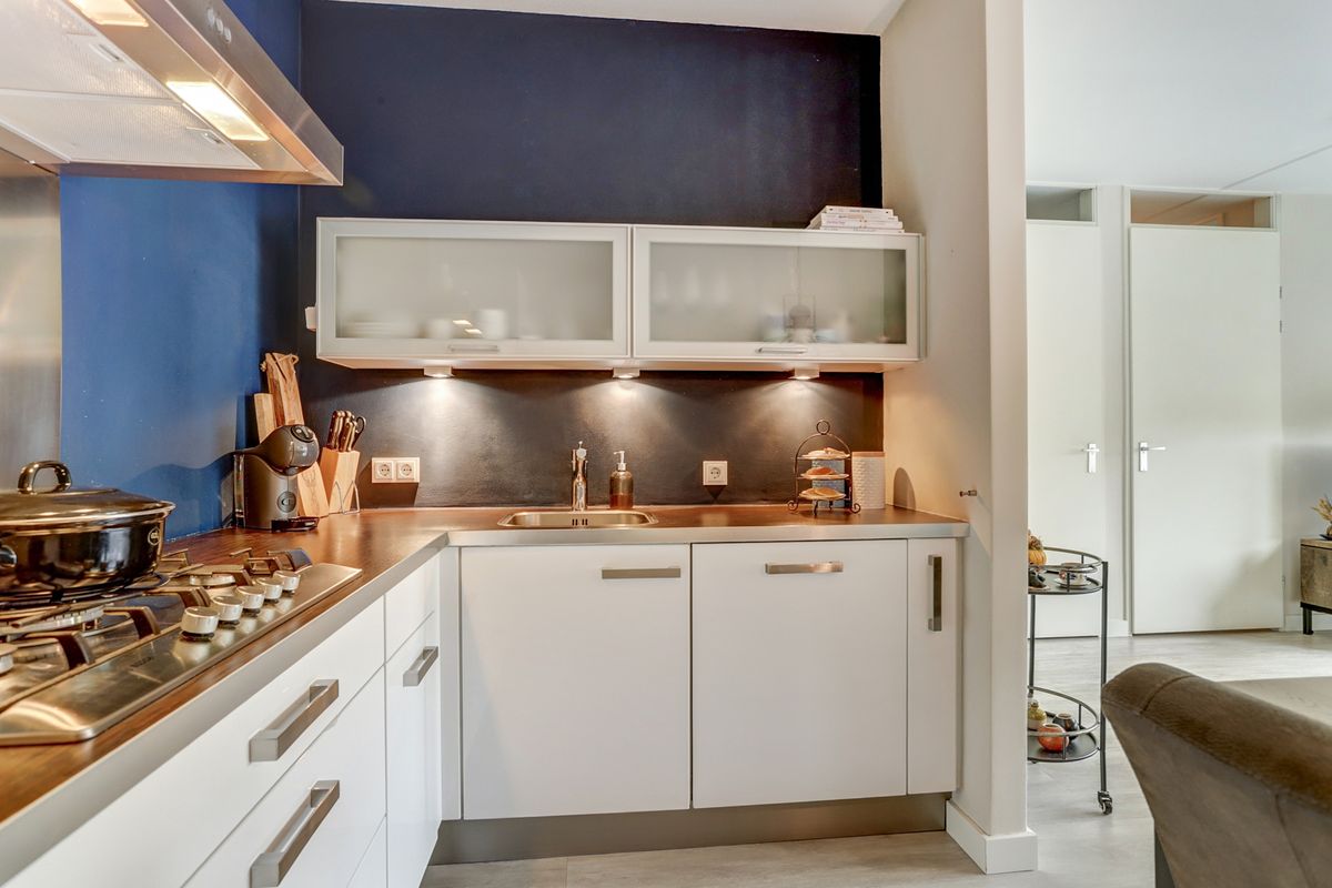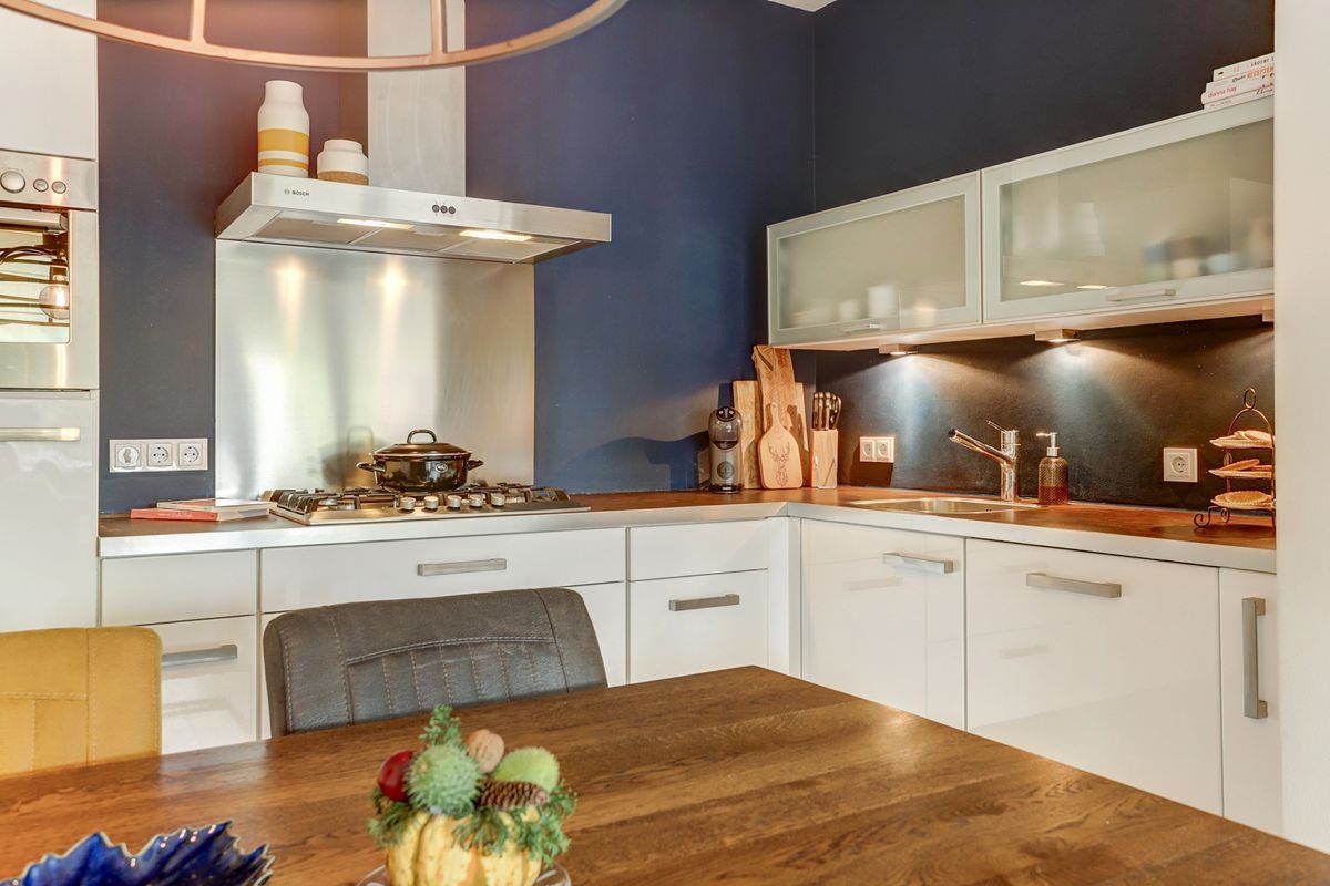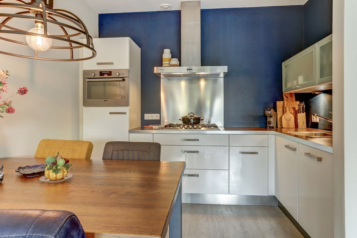 Vanuit de woonkamer loop je door naar de royale keuken, welke geplaatst is in een praktische hoekopstelling en voorzien is van voldoende werkblad én kastruimte. Je vind hier alles wat je nodig hebt om de lekkerste maaltijd op tafel te zetten: een 5-pits gaskookplaat met afzuigkap, vaatwasser, combi-oven, koelkast en een handige apothekerskast, ideaal voor je kruiden netjes in op te bergen.