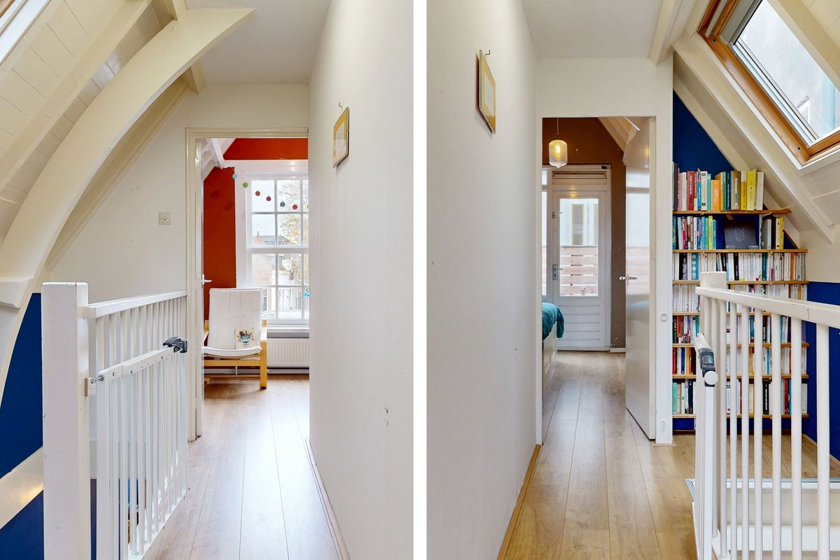 Overloop met extra daglicht dankzij een Velux dakraam. Aan de voorzijde een sfeervolle slaapkamer met vaste kasten, balkenplafond en prachtig uitzicht over het water. Aan de achterzijde een tweede slaapkamer met toegang tot het dakterras. Vanuit de tweede slaapkamer is tevens toegang tot de badkamer met douche en wastafel.