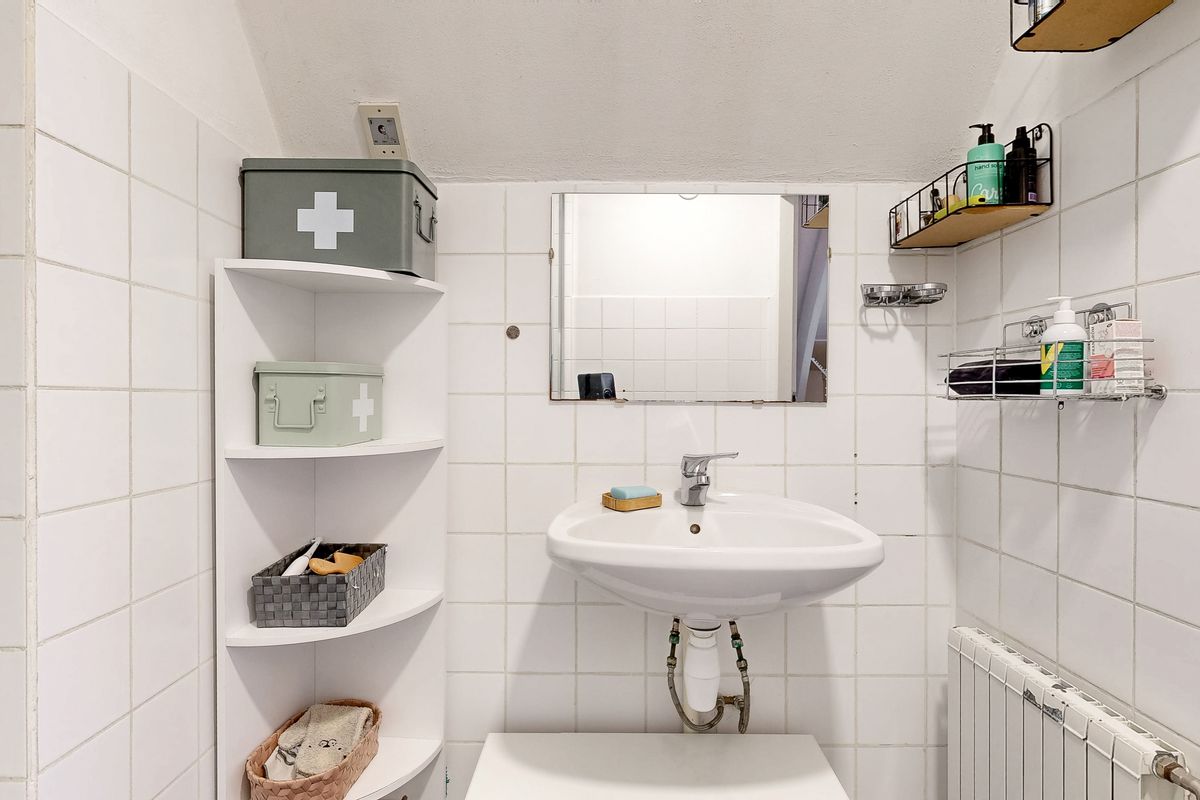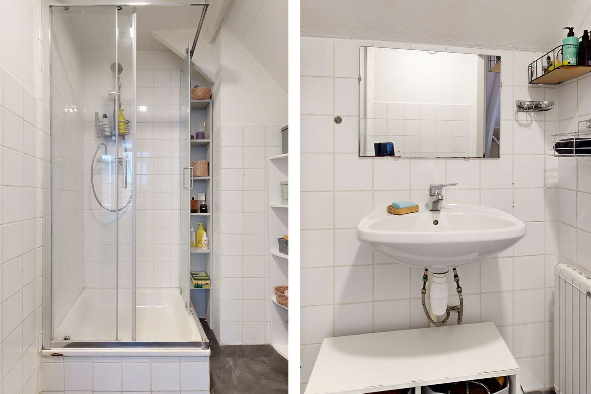 Landing with additional daylight thanks to a Velux skylight. At the front, a cozy bedroom with built-in wardrobes, beamed ceiling, and beautiful views over the water. At the rear, a second bedroom with access to the rooftop terrace. The bathroom, accessible from the second bedroom, includes a shower and sink.