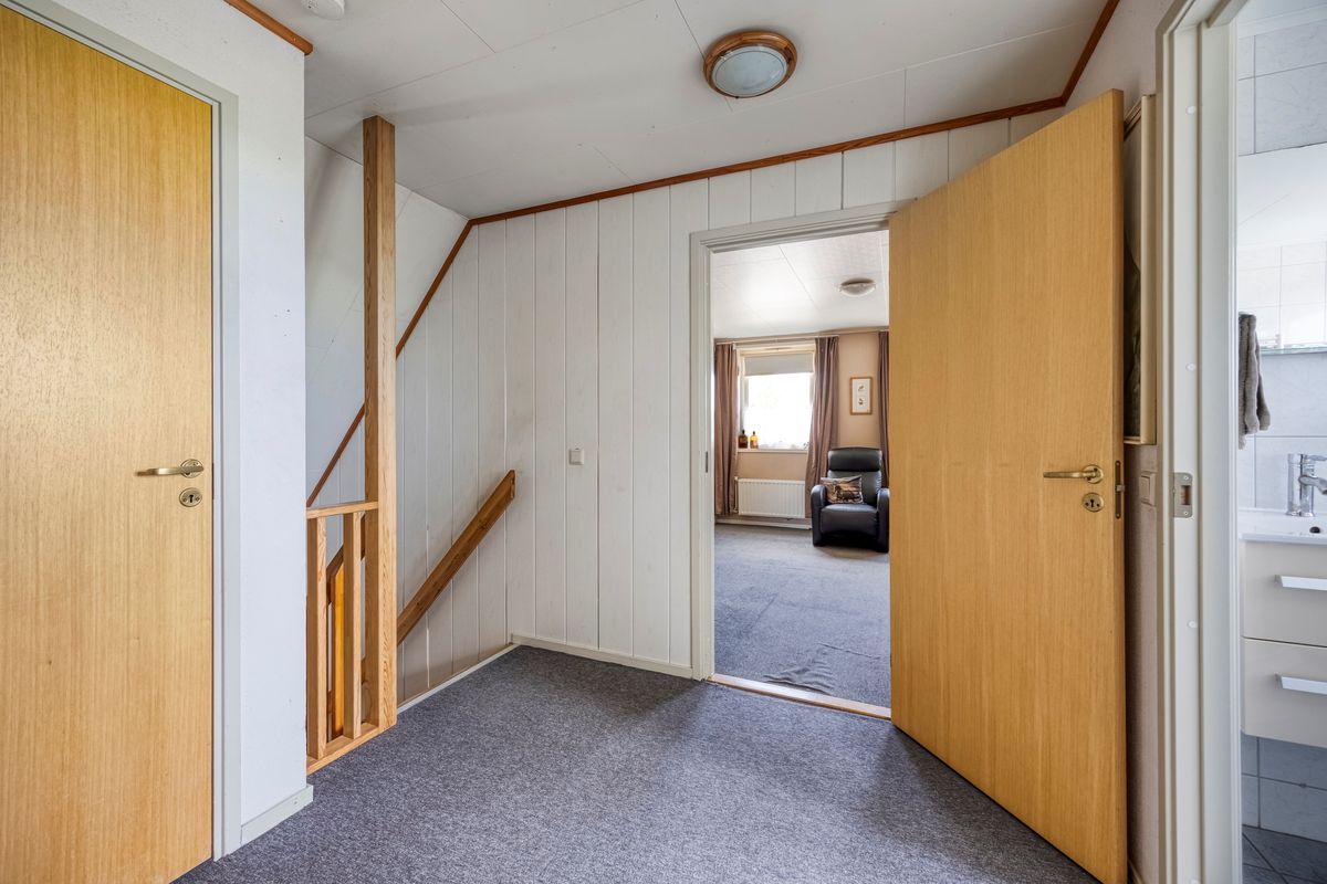 Overloop met toegang tot 3 slaapkamers. De master bedroom is voorzien van een vaste kledingkast. Badkamer voorzien van bad, dubbele wastafel en douche. Door de dakkapel voldoende ruimte en uitzicht op de landerijen.