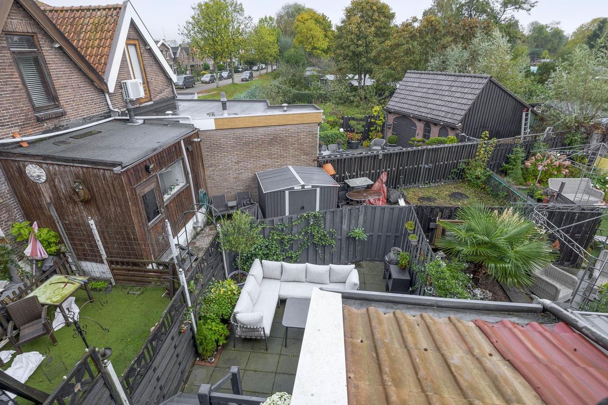 De achtertuin (N) heeft een heerlijk formaat en momenteel is er een gezellig balkon en een fijn terras. Natuurlijk is er ook groen of gras toe te voegen. Veel mogelijkheden dus.