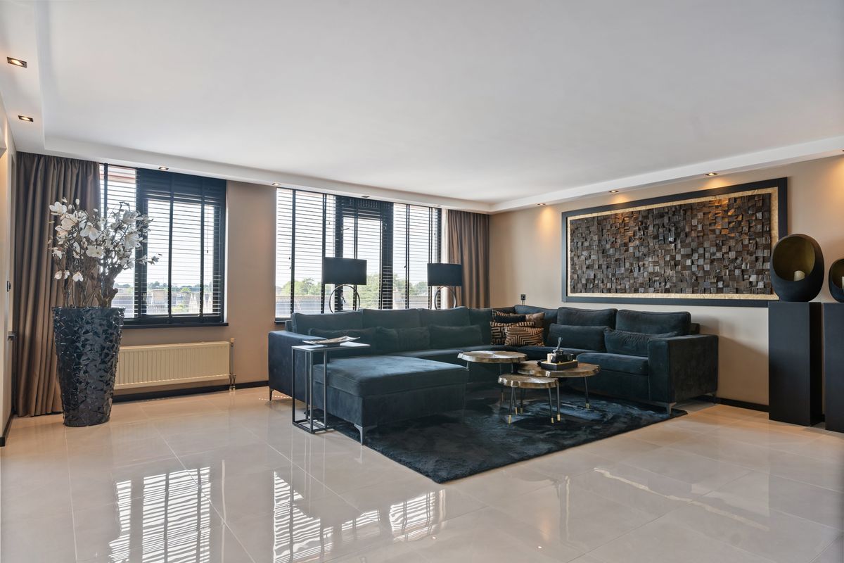 Royale woonkamer met toegang tot het balkon, sfeervolle lichtkoof en cinemawall. Stucwanden en stucplafond. Plavuizenvloer.