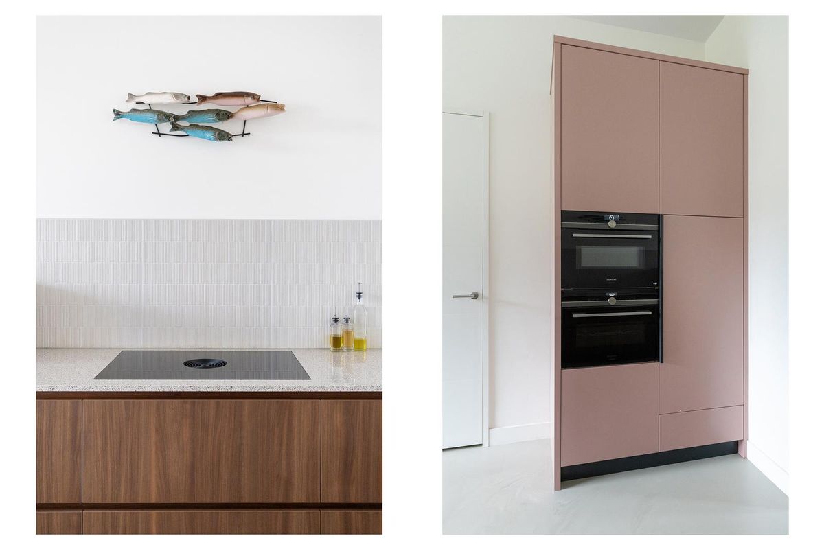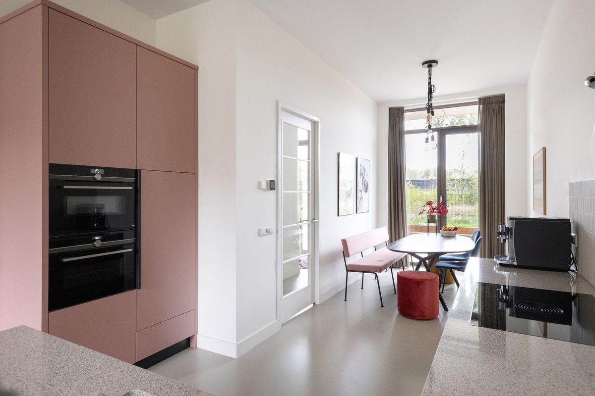 Je stapt binnen in de ruime hal, waar volop plek is voor een garderobe en schoenenkast. Vanuit hier kom je direct in het eetgedeelte met open keuken. Deze vormt het hart van de begane grond. De keuken is op maat gemaakt door timmerbedrijf Rijksen en uitgerust met hoogwaardige apparatuur zoals een Bora inductiekookplaat met geïntegreerde afzuiging, combioven, tweede oven, koelkast, vaatwasser en een Quooker met ingebouwde zeeppomp.