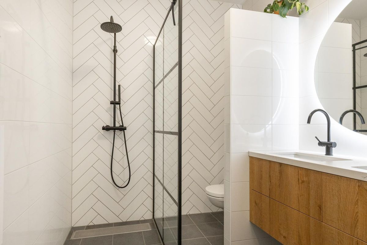De badkamer is modern en comfortabel ingericht met een inloopdouche, dubbele wastafel (maatwerk door Rijksen), toilet en designradiator. Verder is er een aparte technische ruimte met bergruimte en wasmachineaansluiting.
