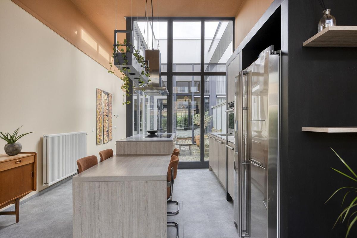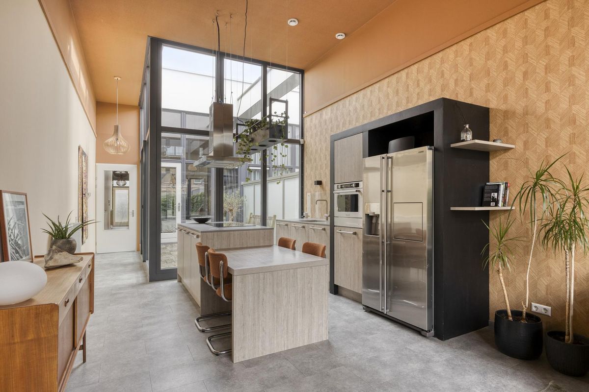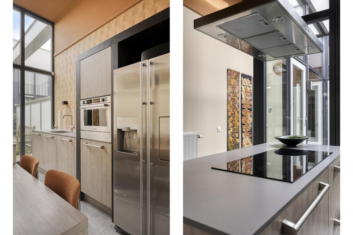 De keuken is uitgevoerd met een kookeiland inclusief geïntegreerde eettafel en diverse inbouwapparatuur, zoals een gasfornuis, afzuigkap, combi-oven, vaatwasser en koel-vriescombinatie met ijsmachine.