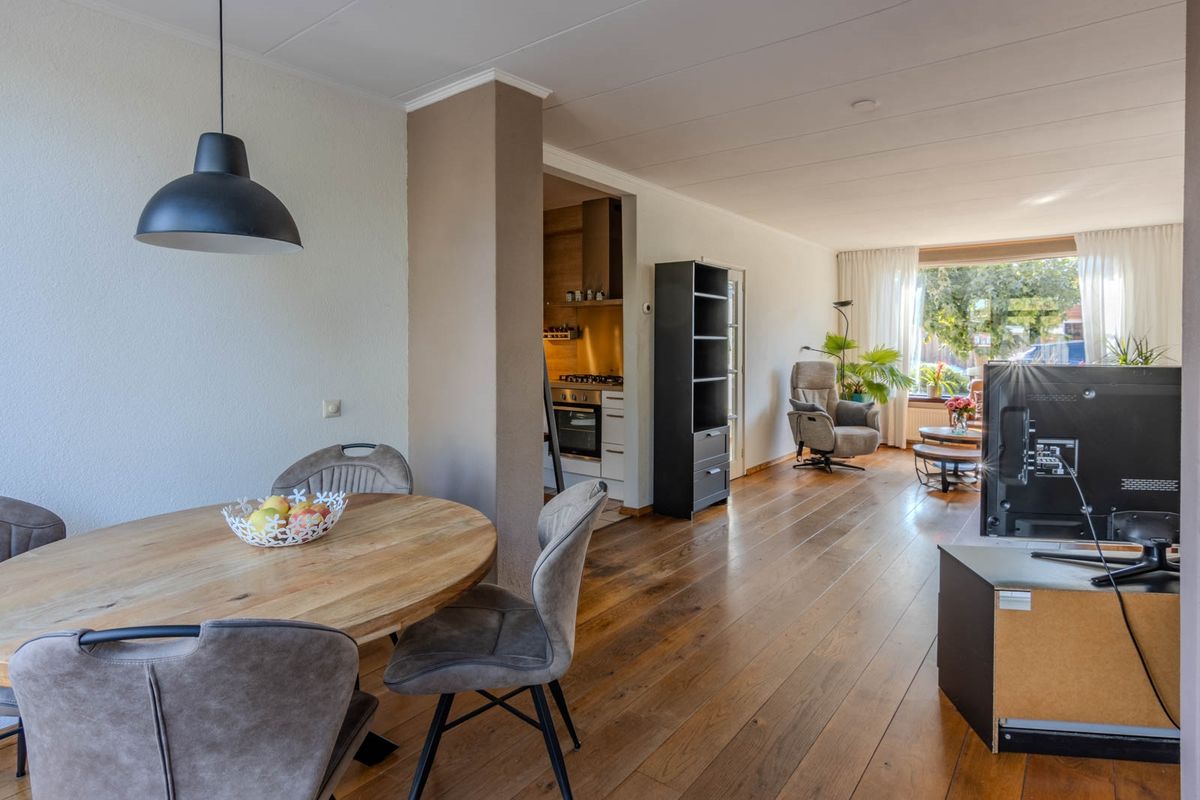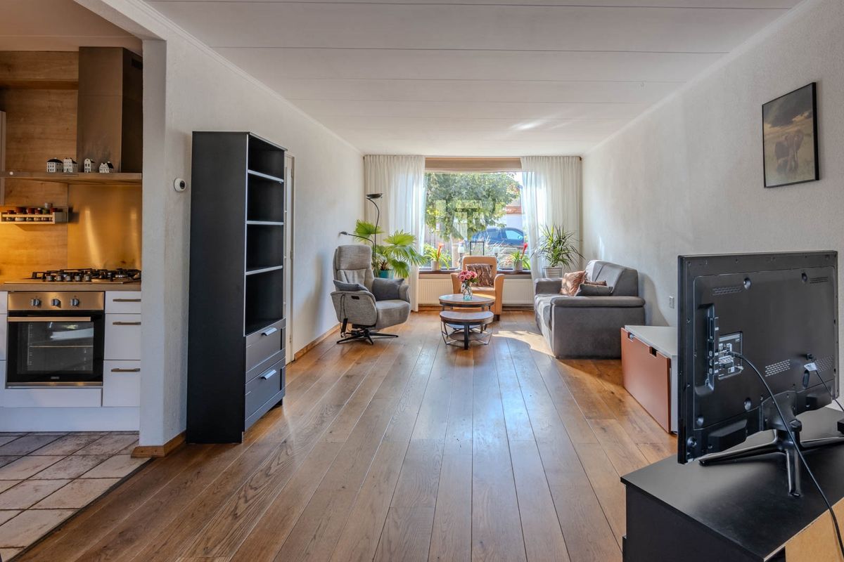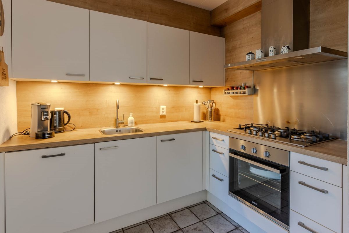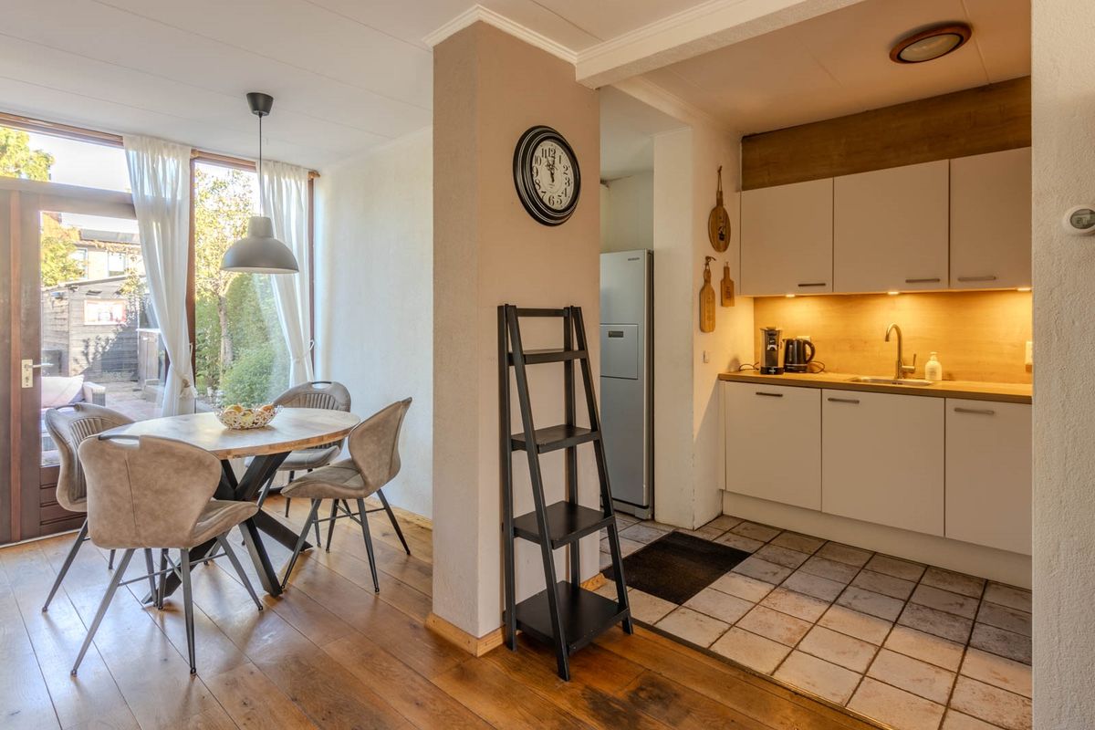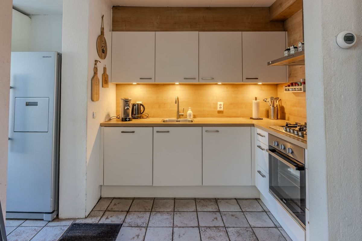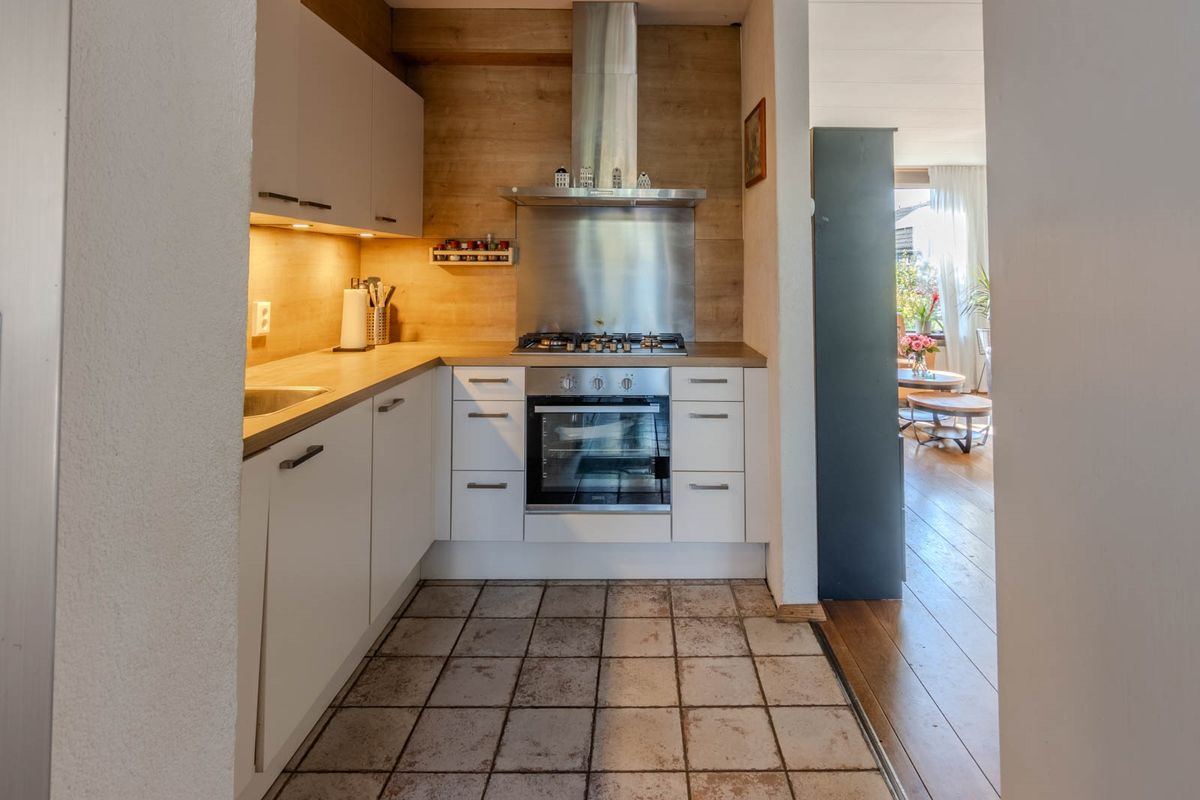 De woonkamer biedt toegang tot de open keuken. De keuken in L-opstelling is in 2021 gerenoveerd en is voorzien van een 5-pits gaskookplaat, een oven, heeft een vaatwasser en een losse koel-vriescombi.