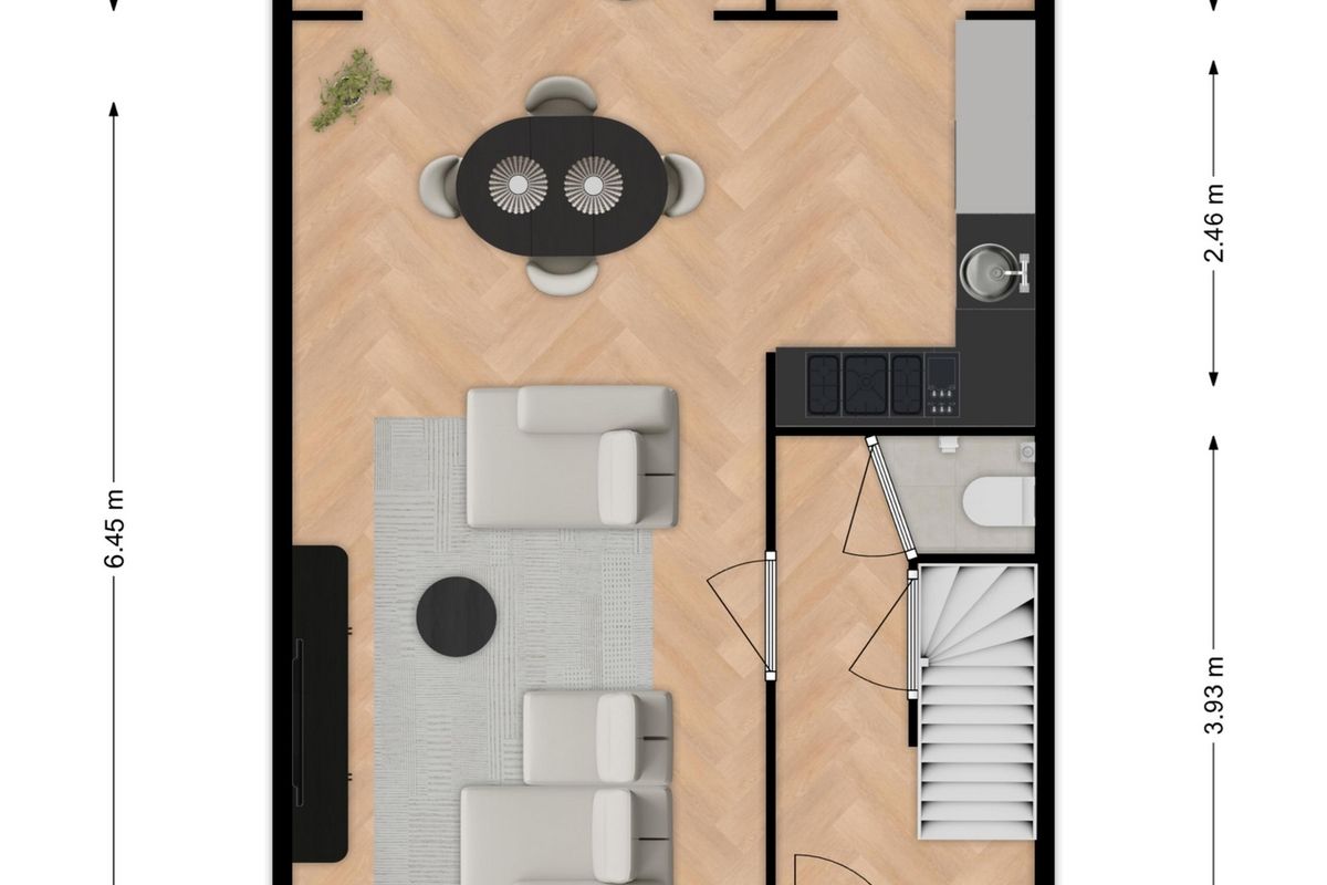 Woonkamer/keuken is circa 38 m²