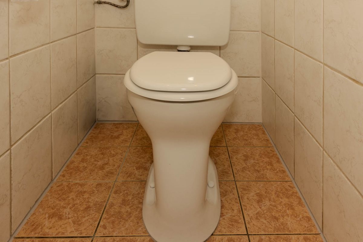 Het toilet is half betegeld en is voorzien van een staand toilet.