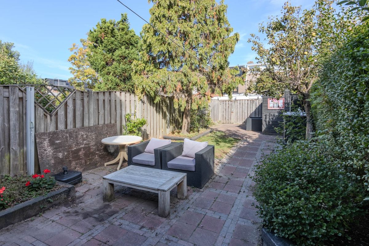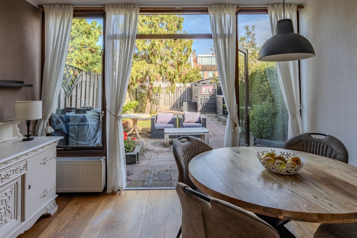 De openslaande deuren in de woonkamer en de keukendeur in de bijkeuken bieden toegang tot de zeer ruime achtertuin gelegen op het noorden. De achtertuin is voorzien van een achterom en heeft een stenen en een houten berging.