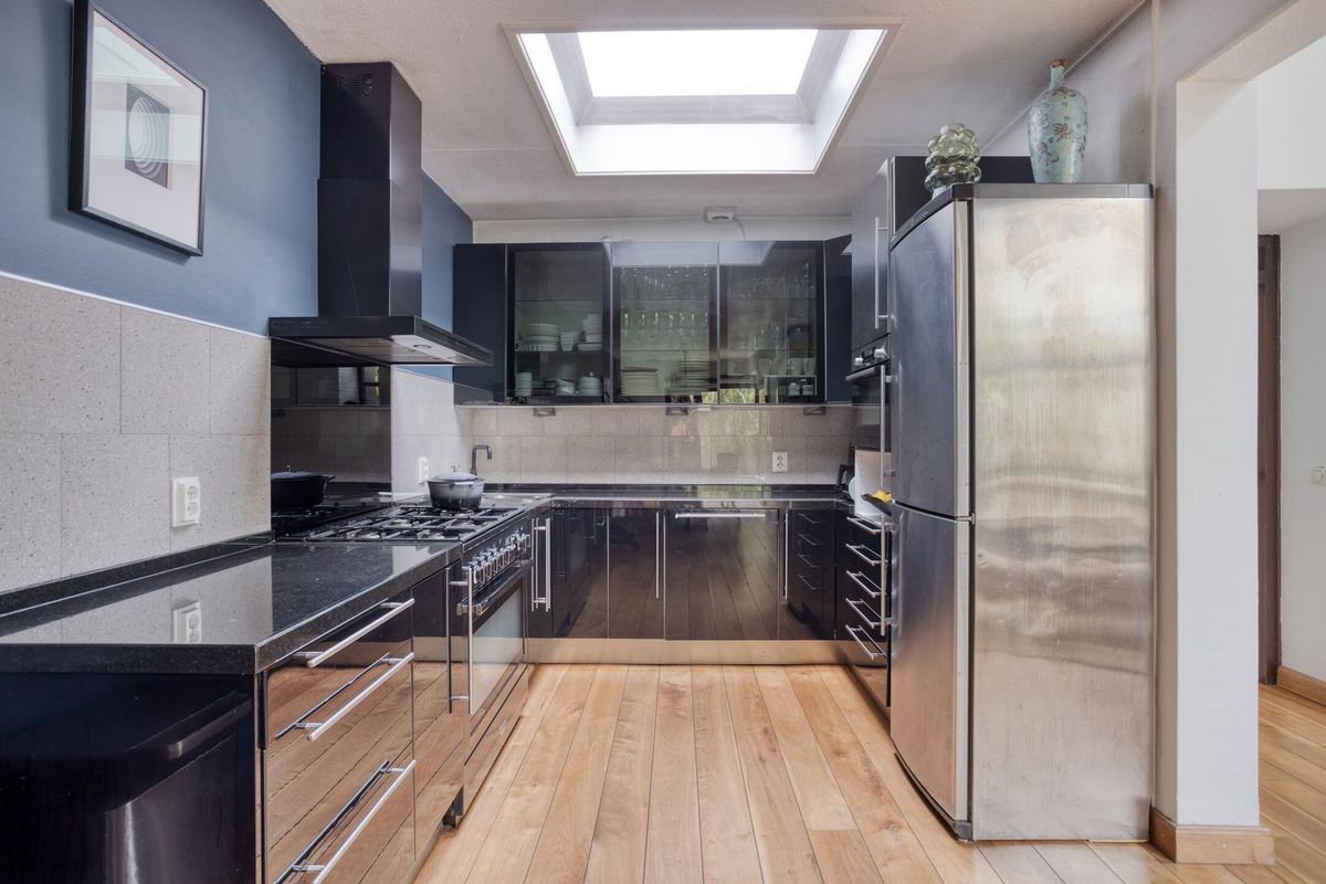 De open keuken in moderne stijl heeft een hoogglans afwerking en volop kastruimte. De inbouwapparatuur bestaat uit een luxe 5-pits gasfornuis met grote oven (bestaande uit 2 delen), afzuigkap, vaatwasser en een losse koel-/vriescombinatie. De keuken staat in open verbinding met de eetkamer, wat het geheel een ruim en uitnodigend karakter geeft.