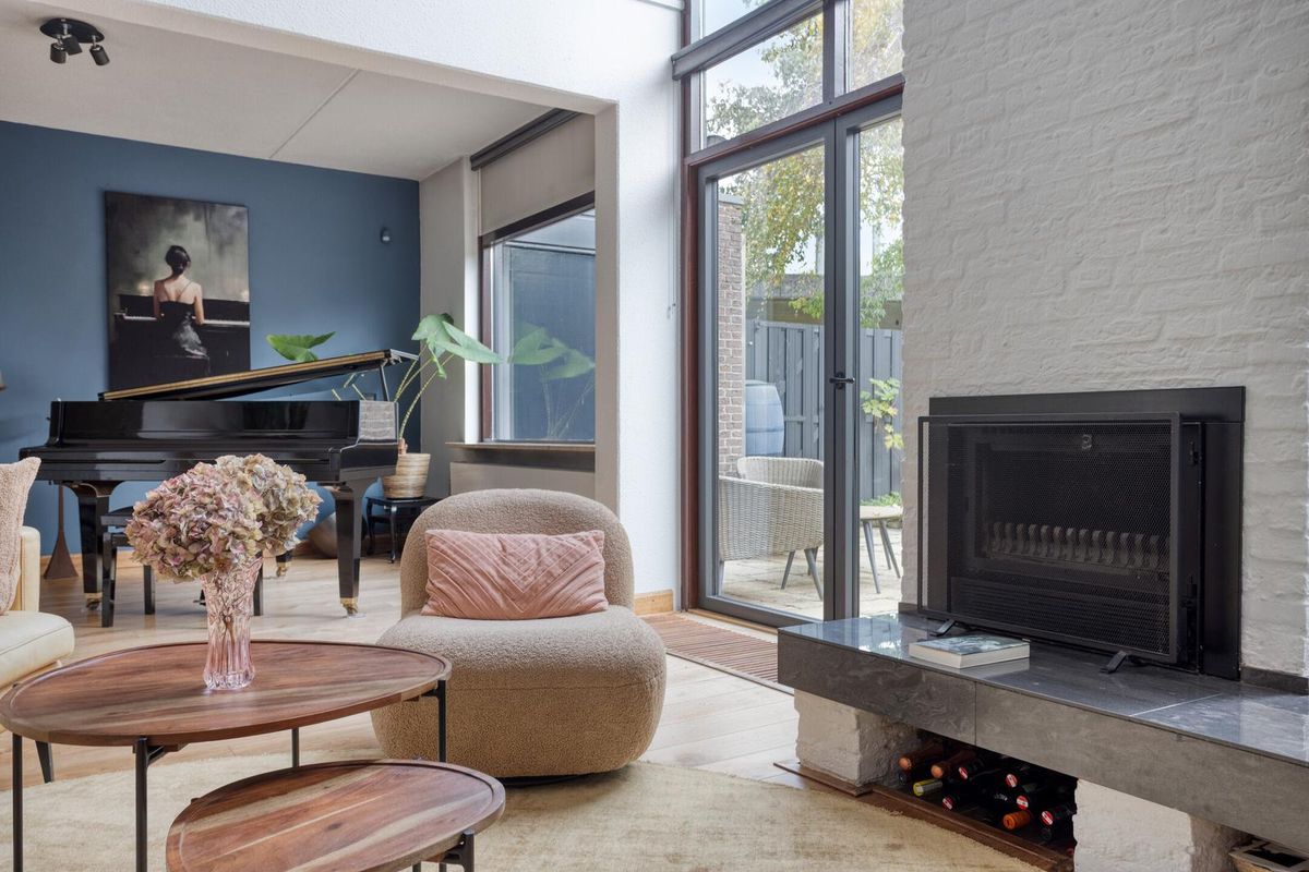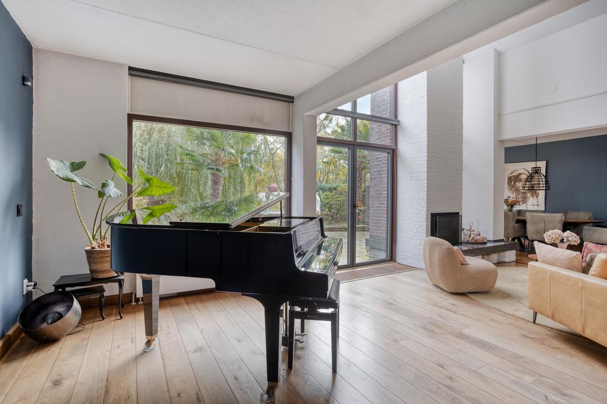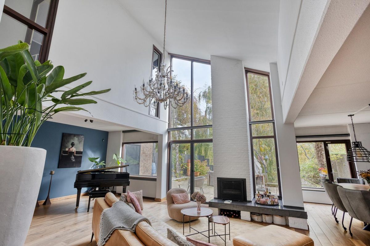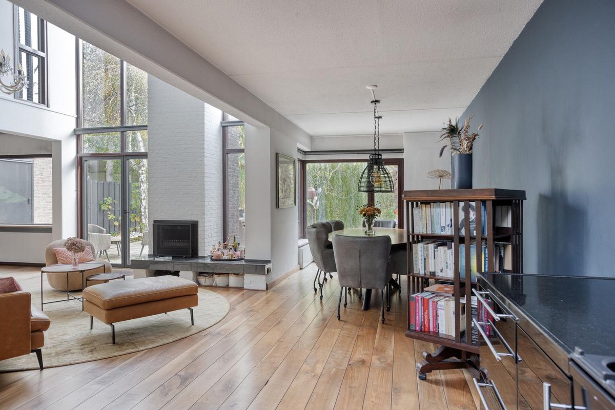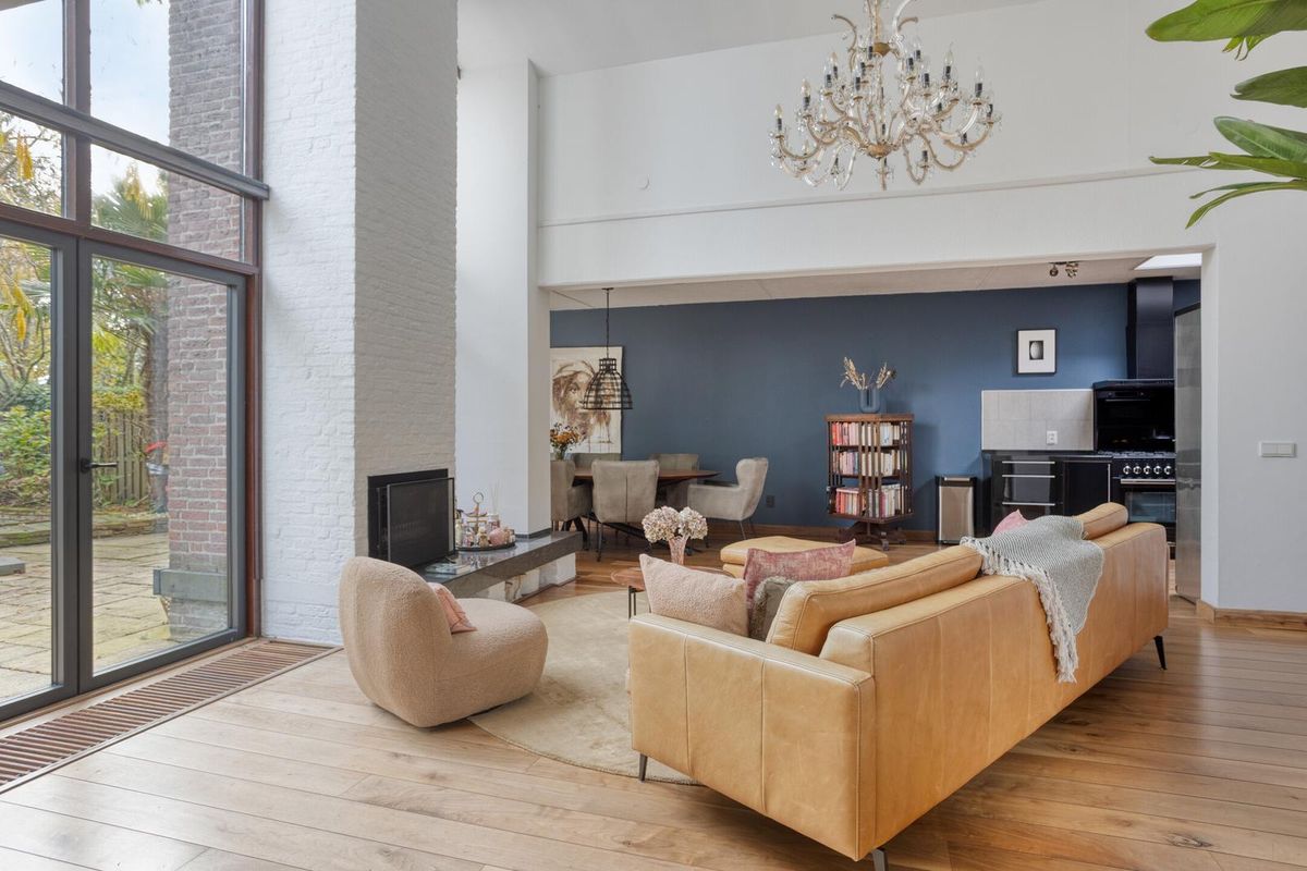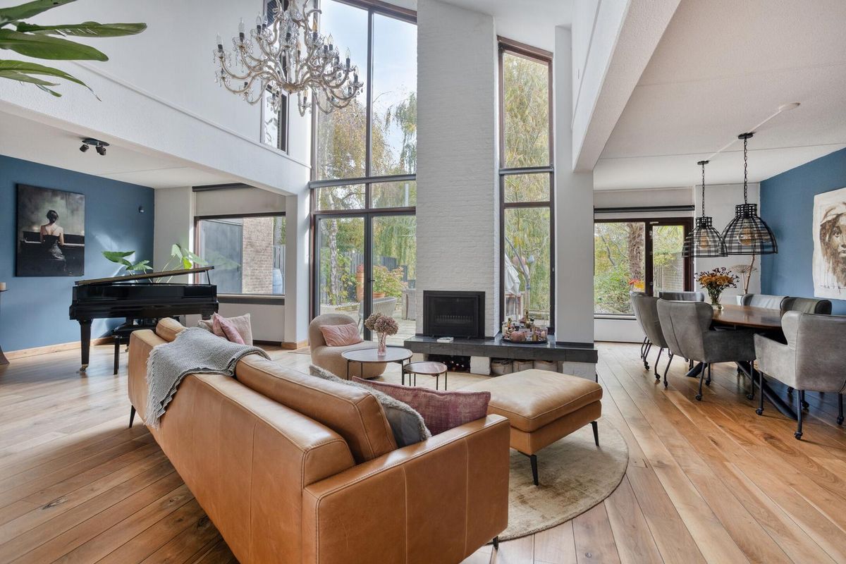 De woonkamer is riant – bijna 10 meter breed – en heeft een prachtige lichtinval door de grote raampartijen en het speelse hoge plafond. De notenhouten vloer en de sfeervolle open haard zorgen voor een warm geheel.