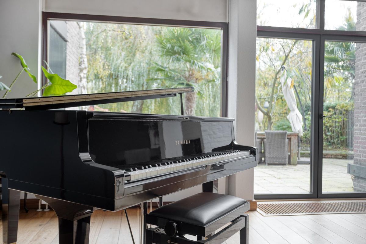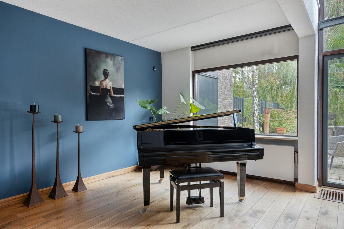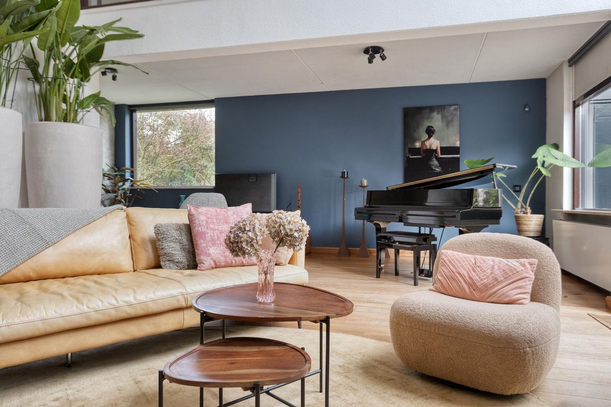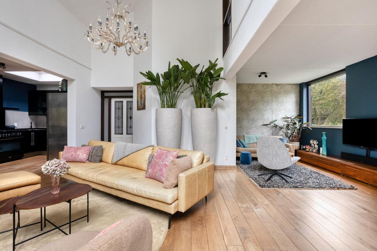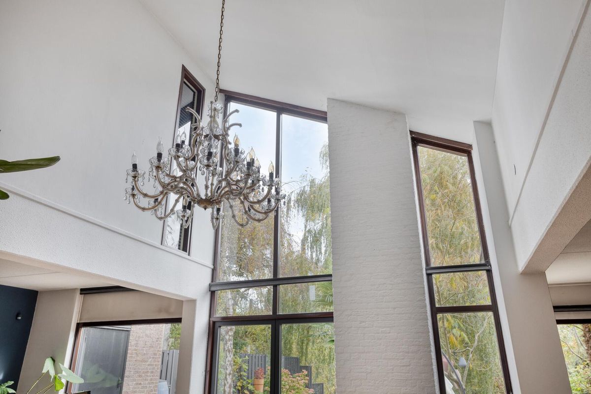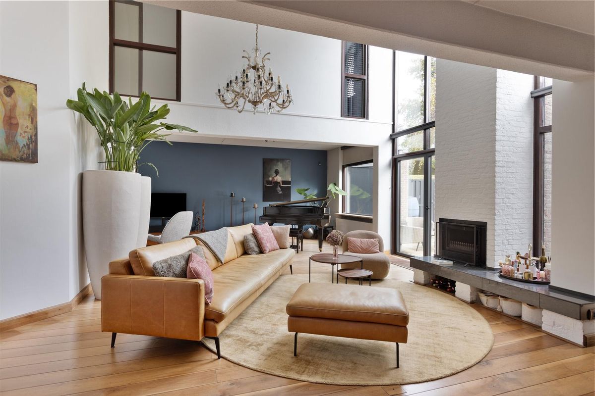 De woonkamer is riant – bijna 10 meter breed – en heeft een prachtige lichtinval door de grote raampartijen en het speelse hoge plafond. De notenhouten vloer en de sfeervolle open haard zorgen voor een warm geheel.