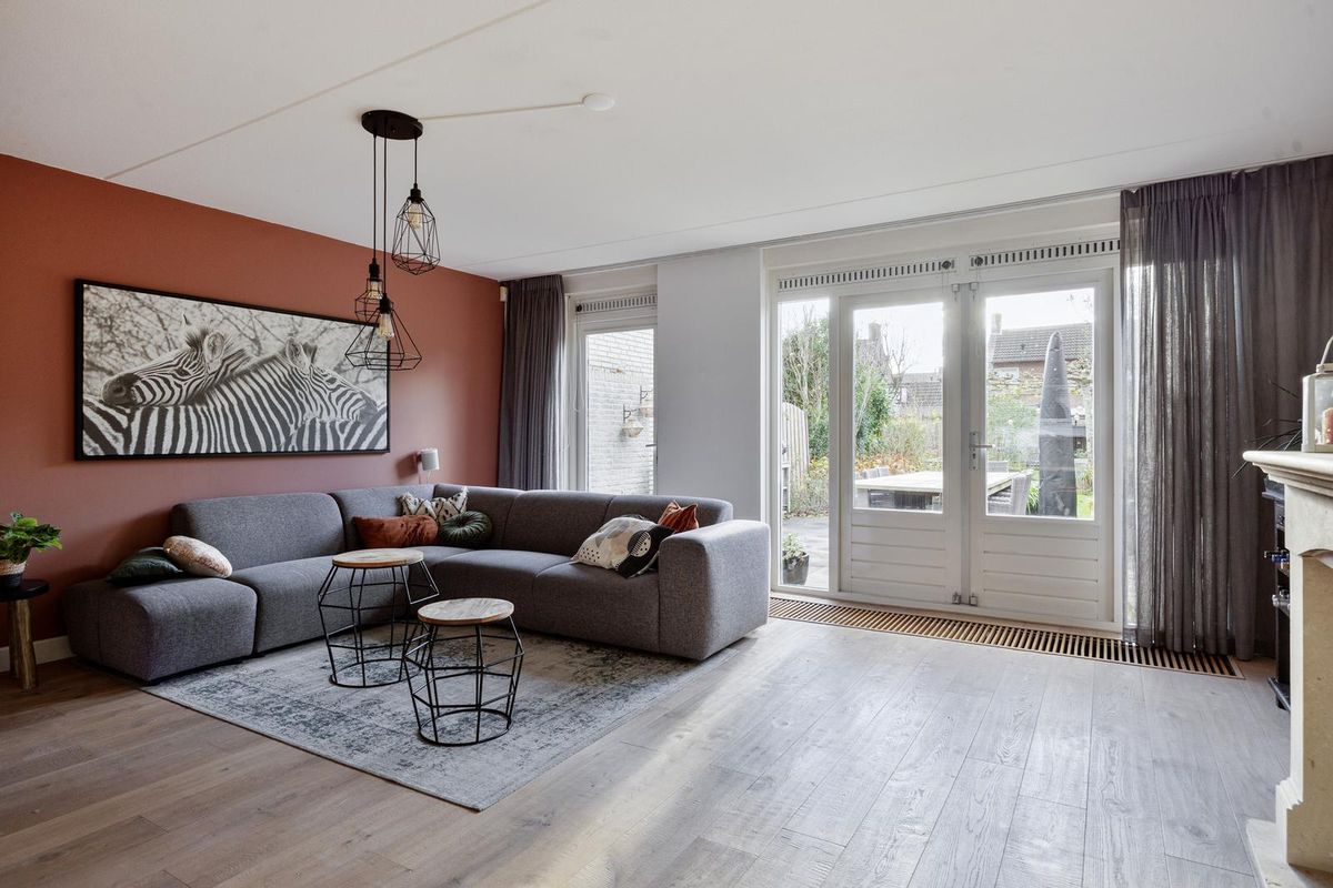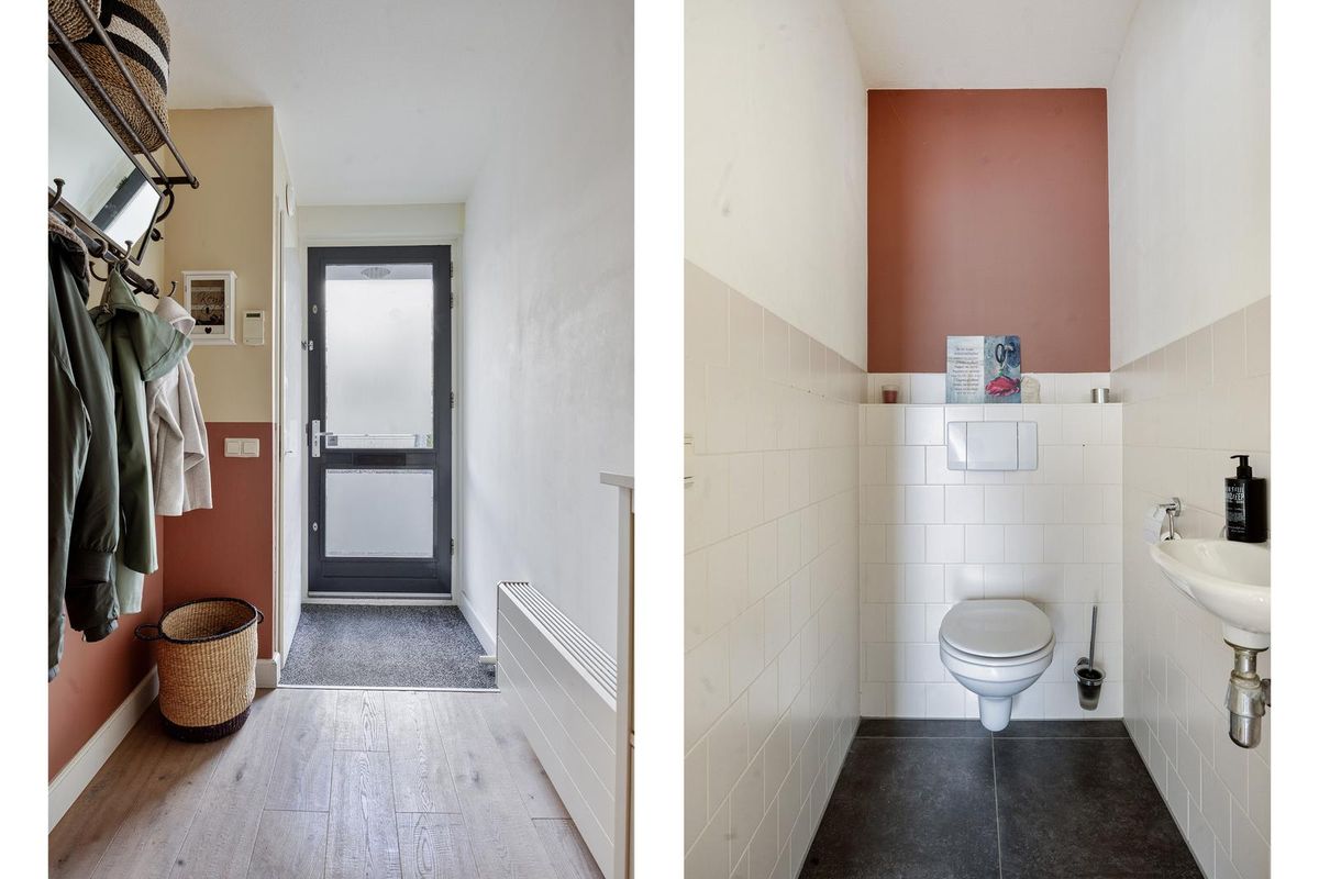 Via de ruime voortuin (6,3 meter diep!) met buitenkraan betreed je de woning. In de hal vind je de meterkast, het moderne toilet en de trapopgang. De eikenhouten vloer loopt drempelloos door over de gehele begane grond en geeft direct een warme sfeer.