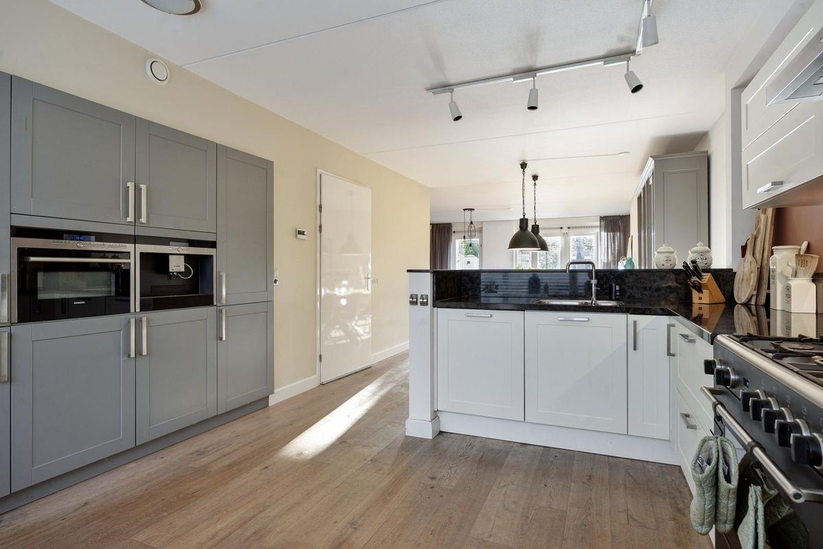 Aan de voorzijde ligt de royale keuken met een combinatie van een L-opstelling en een hoge kastenwand. Deze keuken is een paradijs voor kookliefhebbers, compleet met o.a. Quooker, vaatwasser, 5-pits fornuis met Smeg oven, rvs-afzuigkap, én diverse Siemens-apparatuur (koelkast, vriezer, combi-magnetron en koffiemachine).