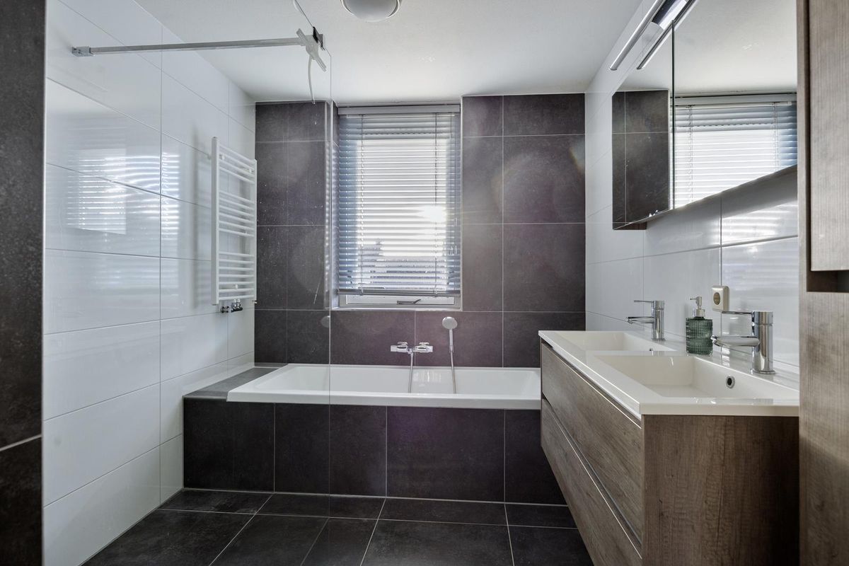 De badkamer is compleet en stijlvol: volledig betegeld in grijs en wit, met een dubbel wastafelmeubel, inloopdouche met regen- en handdouche, én een 2-persoonszitbad. Dankzij het raam en de mechanische ventilatie is er altijd frisse lucht.