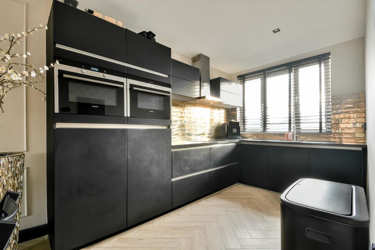 De open keuken aan de voorzijde is strak vormgegeven en voorzien van moderne inbouwapparatuur, waaronder een Miele vaatwasser, Siemens oven, Siemens inductieplaat, Siemens afzuigkap en een dubbele koelkast met vriesgedeelte.