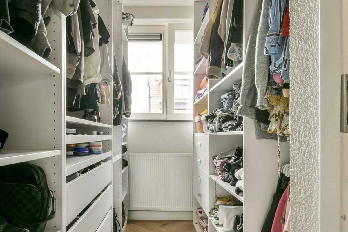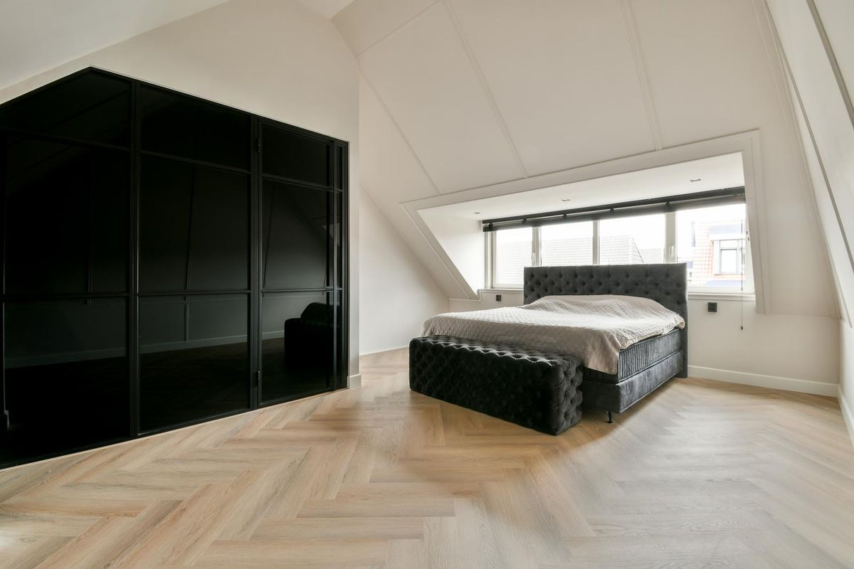 Via een vaste trap bereik je de zolderverdieping, waar achter een stijlvolle stalen deur de royale hoofdslaapkamer te vinden is. Deze kamer is voorzien van een dakkapel, wat zorgt voor extra licht en ruimte. Hier bevindt zich tevens een ligbad en een aparte hoek met aansluitingen voor de wasmachine en droger, netjes weggewerkt achter maatwerkpanelen.