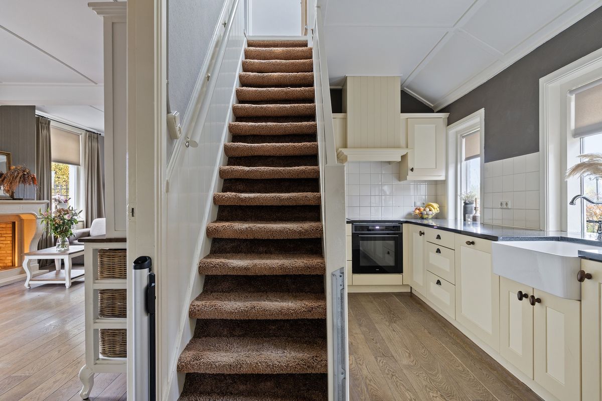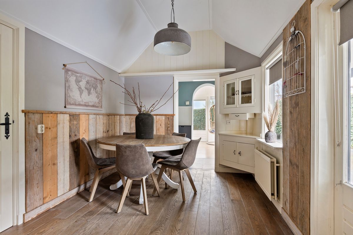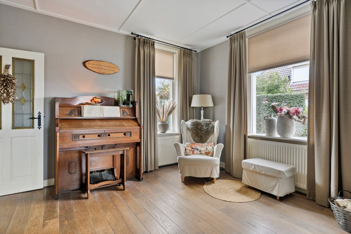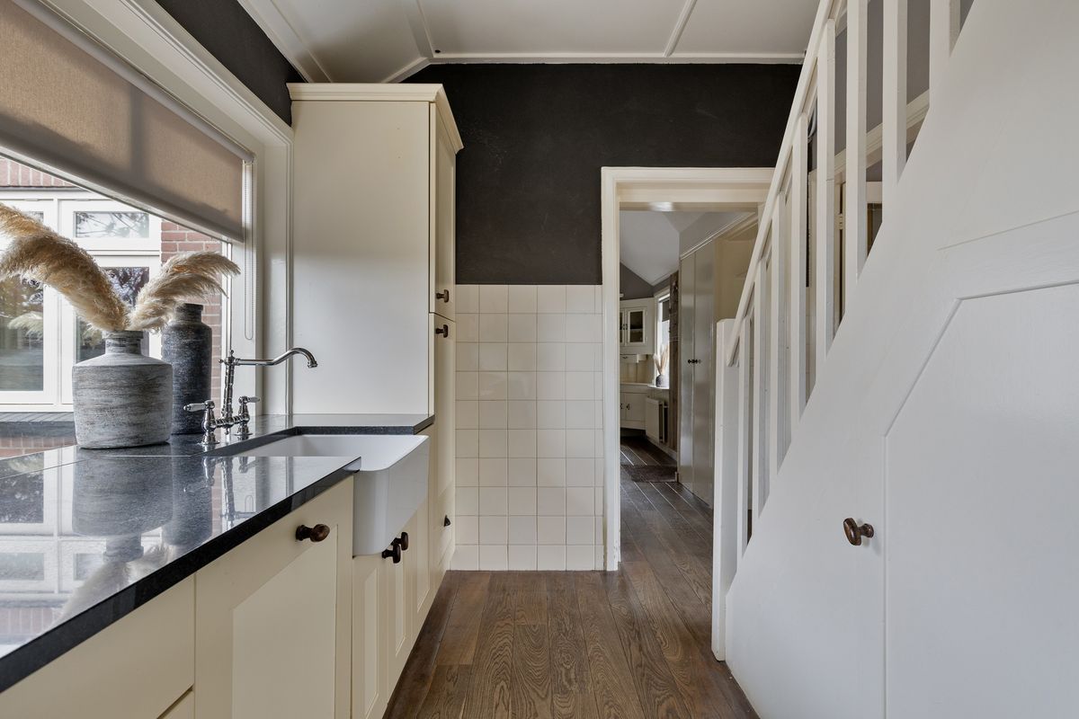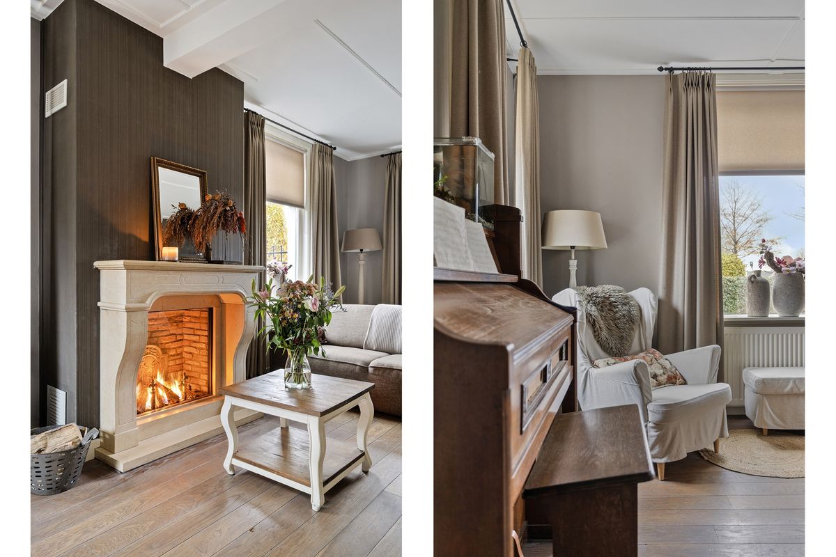De woonkamer is sfeervol ingericht met een gashaard en schouw als middelpunt. De massief eikenhouten vloer geeft de ruimte een fijne, natuurlijke uitstraling. Aangrenzend ligt een praktische speel- of werkkamer, perfect voor thuiswerken, hobby’s of juist een rustige plek voor kinderen. De keuken is ingericht met een hoekopstelling voorzien van inbouwapparatuur. Onder de trap bevindt zich een praktische provisiekast en vanuit de keuken neem je de trap naar de eerste verdieping. Grenzend aan de keuken ligt de eetkamer met een diepe inbouwkast én een deur naar het overdekte terras naast de woning. Het toilet is modern uitgevoerd als zwevend model met fonteintje. Dankzij de uitbouw vind je op de begane grond een ruime slaapkamer met kastenwand én een moderne badkamer. Deze badkamer is ingericht met een ligbad, inloopdouche, wastafelmeubel met twee waskommen en ingebouwde kranen. Ook de witgoedaansluitingen zitten hier praktisch verwerkt. Aan de achterzijde bevindt zich de lichte tuinkamer met veel ramen, openslaande deuren en prachtig zicht op de diepe tuin, een heerlijke plek om elk seizoen binnen met buiten te verbinden.