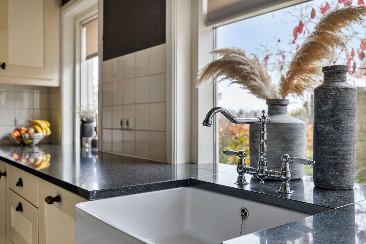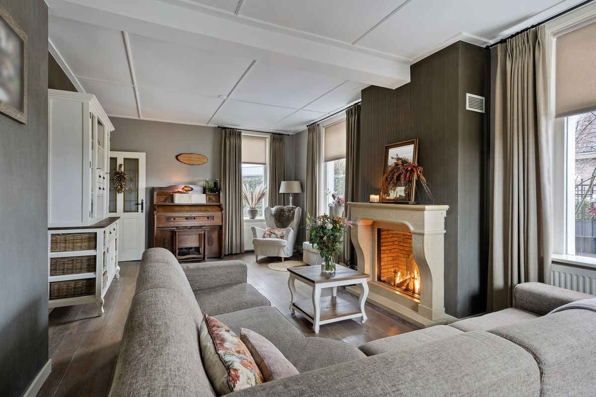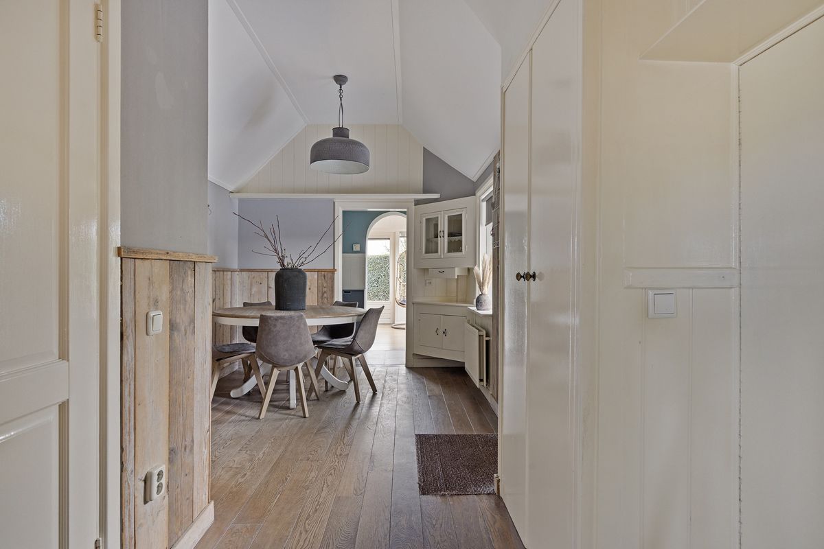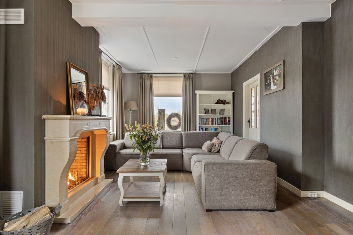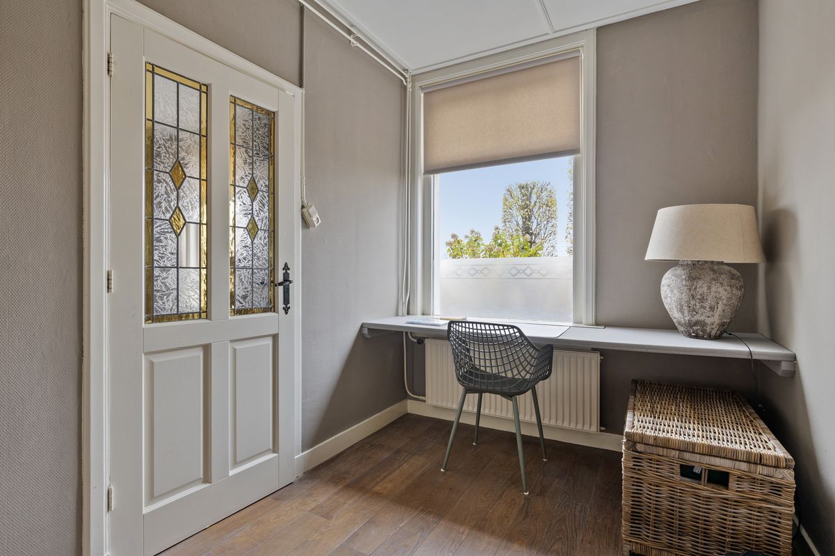De woonkamer is sfeervol ingericht met een gashaard en schouw als middelpunt. De massief eikenhouten vloer geeft de ruimte een fijne, natuurlijke uitstraling. Aangrenzend ligt een praktische speel- of werkkamer, perfect voor thuiswerken, hobby’s of juist een rustige plek voor kinderen. De keuken is ingericht met een hoekopstelling voorzien van inbouwapparatuur. Onder de trap bevindt zich een praktische provisiekast en vanuit de keuken neem je de trap naar de eerste verdieping. Grenzend aan de keuken ligt de eetkamer met een diepe inbouwkast én een deur naar het overdekte terras naast de woning. Het toilet is modern uitgevoerd als zwevend model met fonteintje. Dankzij de uitbouw vind je op de begane grond een ruime slaapkamer met kastenwand én een moderne badkamer. Deze badkamer is ingericht met een ligbad, inloopdouche, wastafelmeubel met twee waskommen en ingebouwde kranen. Ook de witgoedaansluitingen zitten hier praktisch verwerkt. Aan de achterzijde bevindt zich de lichte tuinkamer met veel ramen, openslaande deuren en prachtig zicht op de diepe tuin, een heerlijke plek om elk seizoen binnen met buiten te verbinden.