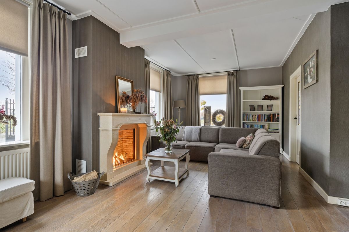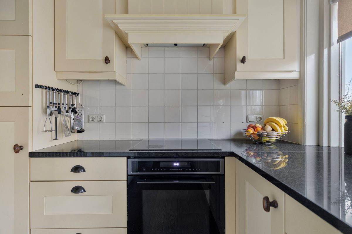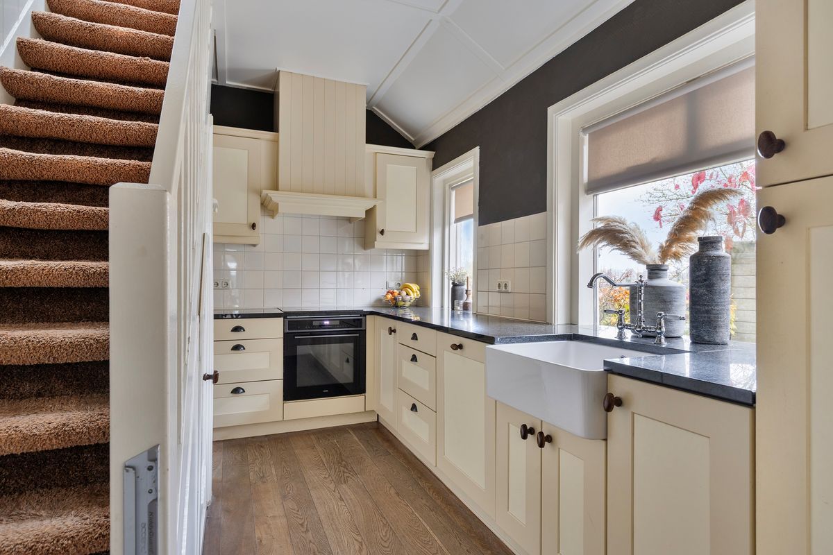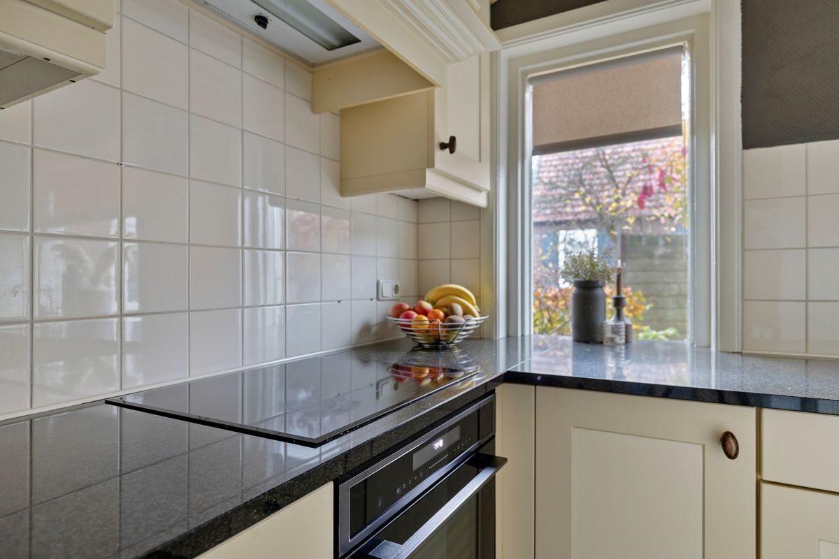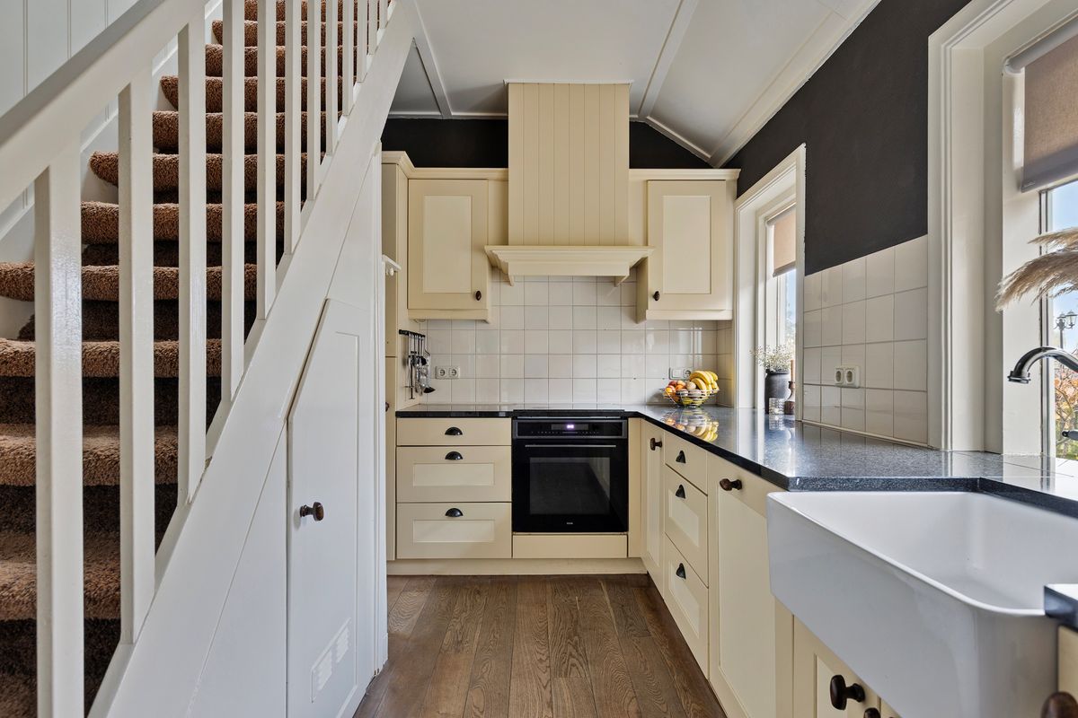 De woonkamer is sfeervol ingericht met een gashaard en schouw als middelpunt. De massief eikenhouten vloer geeft de ruimte een fijne, natuurlijke uitstraling. Aangrenzend ligt een praktische speel- of werkkamer, perfect voor thuiswerken, hobby’s of juist een rustige plek voor kinderen. De keuken is ingericht met een hoekopstelling voorzien van inbouwapparatuur. Onder de trap bevindt zich een praktische provisiekast en vanuit de keuken neem je de trap naar de eerste verdieping. Grenzend aan de keuken ligt de eetkamer met een diepe inbouwkast én een deur naar het overdekte terras naast de woning. Het toilet is modern uitgevoerd als zwevend model met fonteintje. Dankzij de uitbouw vind je op de begane grond een ruime slaapkamer met kastenwand én een moderne badkamer. Deze badkamer is ingericht met een ligbad, inloopdouche, wastafelmeubel met twee waskommen en ingebouwde kranen. Ook de witgoedaansluitingen zitten hier praktisch verwerkt. Aan de achterzijde bevindt zich de lichte tuinkamer met veel ramen, openslaande deuren en prachtig zicht op de diepe tuin, een heerlijke plek om elk seizoen binnen met buiten te verbinden.