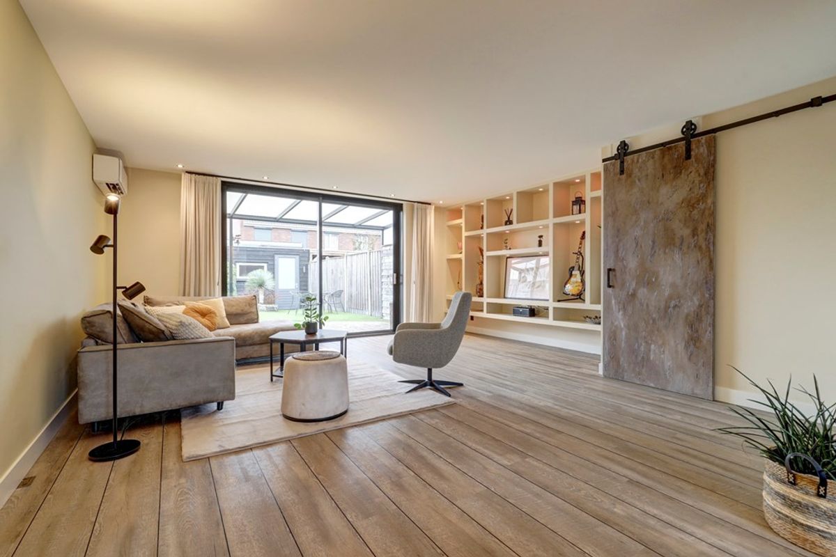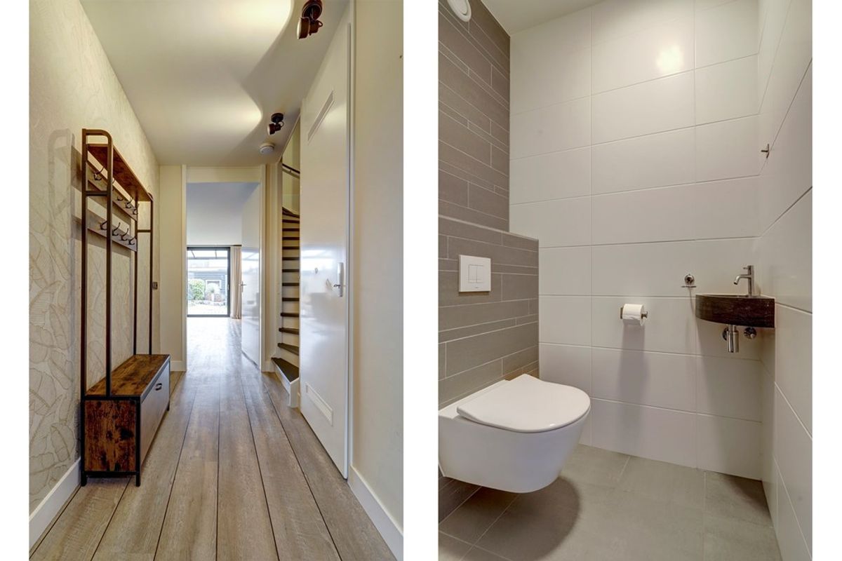 Entree, ruime hal met meterkast, opbouwspotjes en toegang tot een modern toilet met fonteintje en de trapopgang. De royale woonkamer (ca. 30 m²) is tuingericht en strak afgewerkt met een fraaie PVC-vloer met brede planken en hoge plinten. Daarnaast beschikt de woonkamer over een praktische trapkast met schuifdeur, een vaste vakkenkast, inbouwspotjes en een airco-unit. Via de schuifpui loopt u zo de fraai aangelegde achtertuin in.