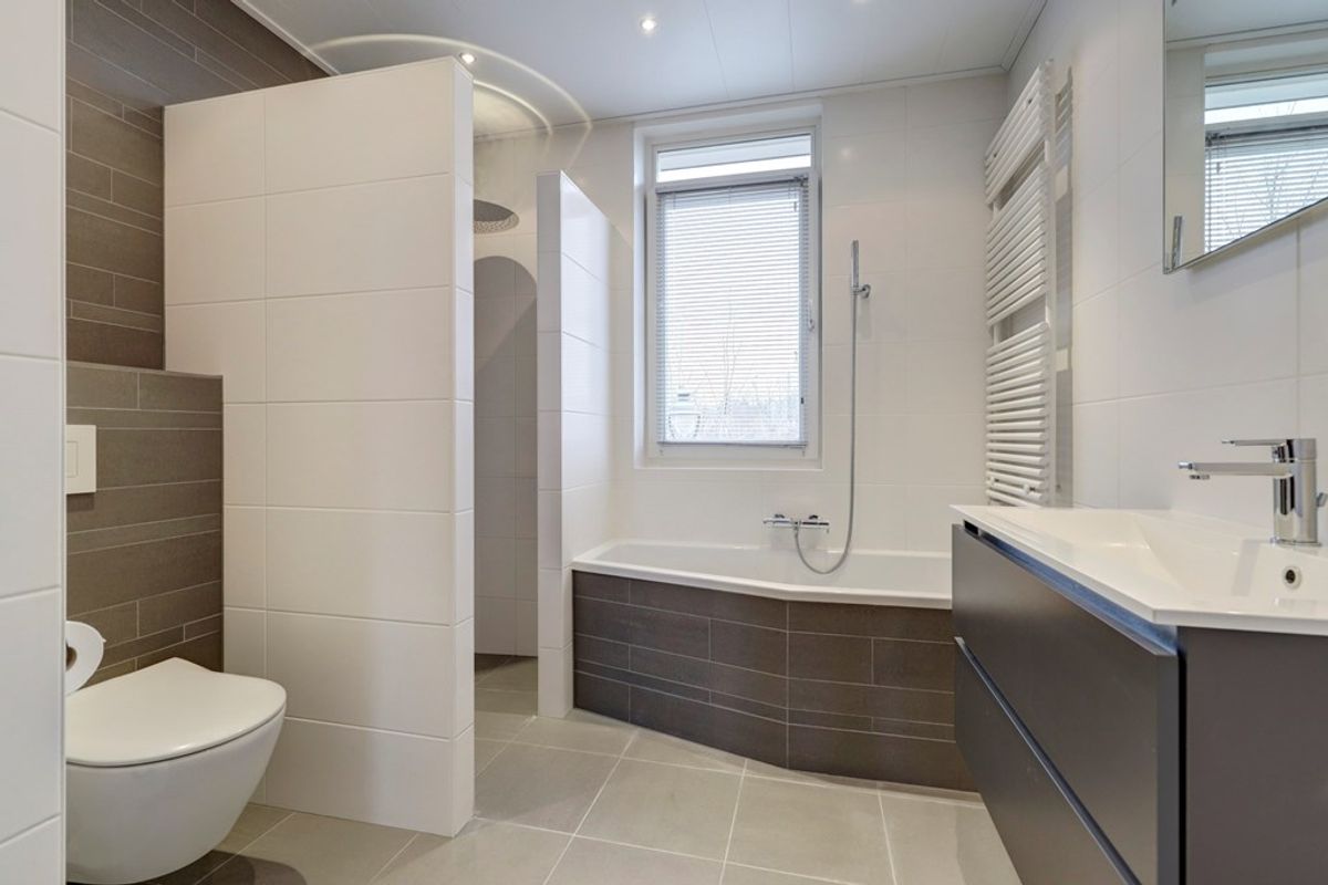 De moderne badkamer is tot aan het plafond betegeld en voorzien van een wastafelmeubel, ruime inloopdouche, ligbad, zwevend tweede toilet, designradiator en inbouwspotjes met radio.