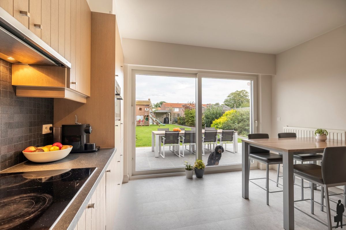 De ontbijthoek biedt zicht op de tuin en via de schuifpui stapt u bij mooi weer zo naar buiten.