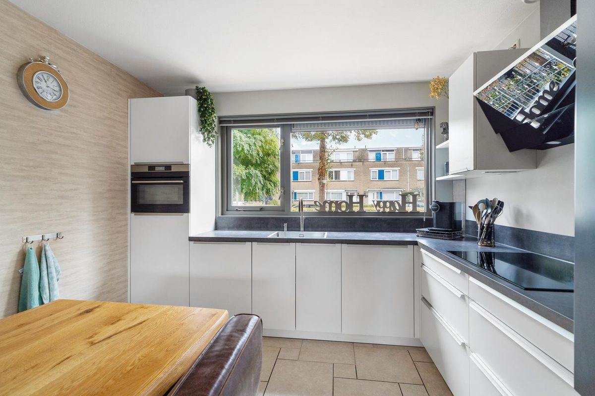 De keuken, gelegen aan de voorzijde van de woning, is een heerlijke lichte ruimte dankzij het brede raam met vrij uitzicht op de straat. De moderne keukenopstelling biedt volop werk- en opbergruimte en is uitgevoerd in een strakke, tijdloze stijl.