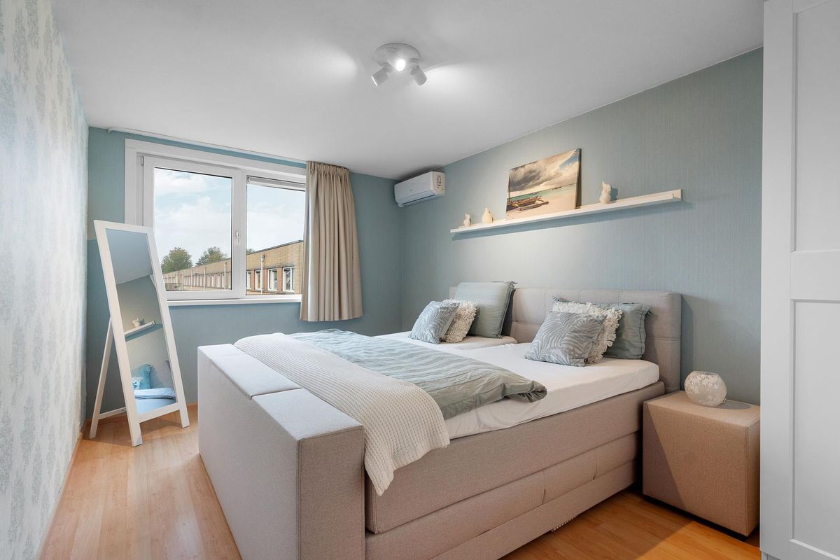 Daarnaast beschikt deze verdieping over een ruime vierde slaapkamer van circa 12 m², voorzien van airconditioning, perfect te gebruiken als slaap-, werk- of hobbyruimte. Vanuit deze kamer stap je zo het heerlijke dakterras op het noordoosten op. Een fijne plek om ’s ochtends rustig wakker te worden of even buiten te ontspannen.