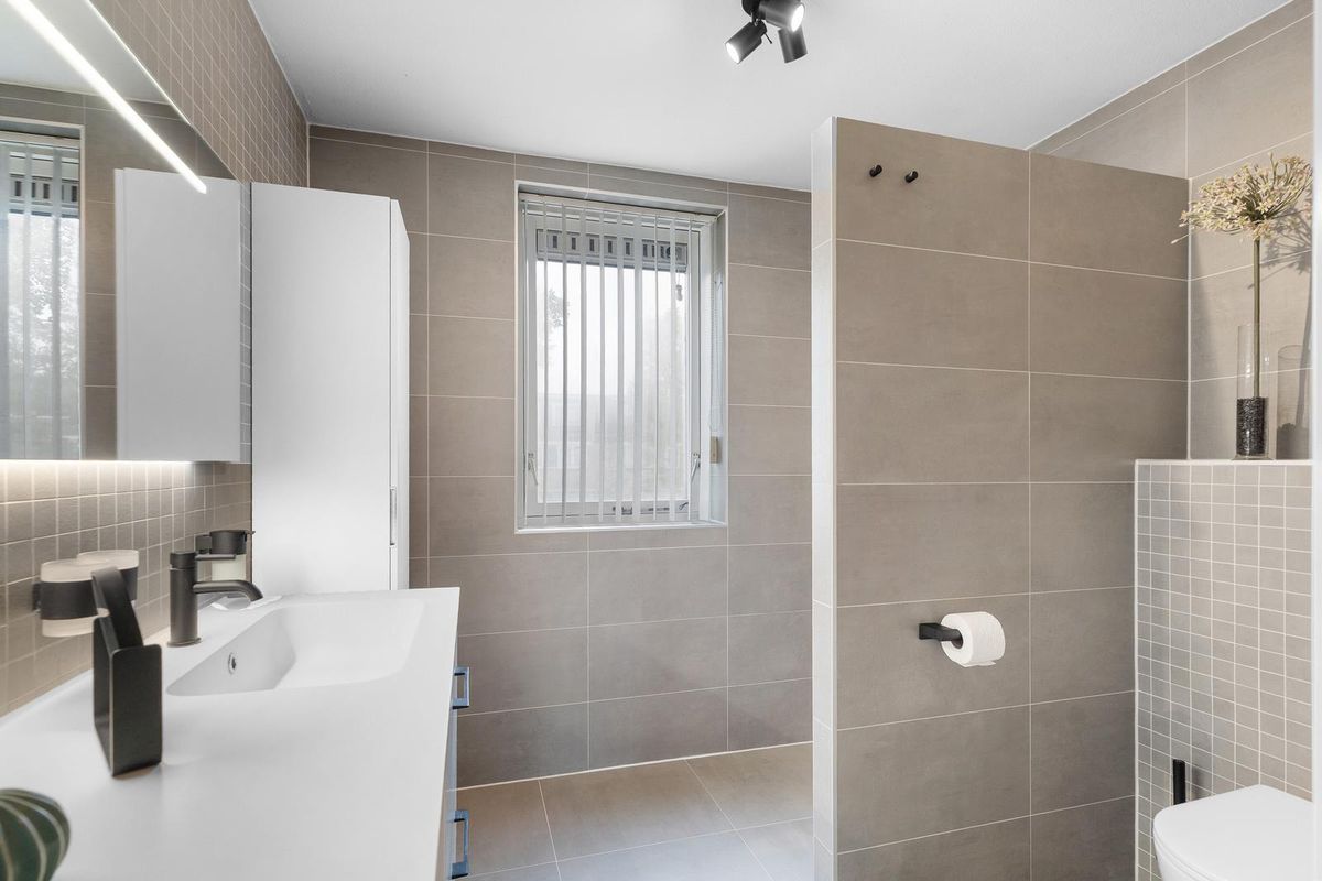 De badkamer is voorzien van een ruime inloopdouche met regendouche, een stijlvol wastafelmeubel met veel bergruimte, een tweede toilet en een designradiator. Alles is strak afgewerkt en direct klaar voor gebruik, een heerlijke plek om de dag ontspannen te beginnen én af te sluiten.