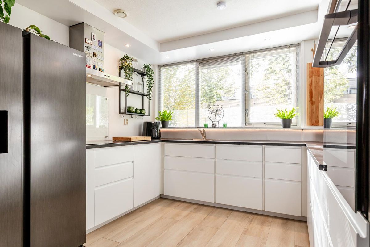 Aan de voorzijde bevindt zich de open keuken, die ruim en praktisch is ingericht met voldoende kastruimte en compleet is uitgerust met inbouwapparatuur. De gehele begane grond is afgewerkt met een nette laminaatvloer.