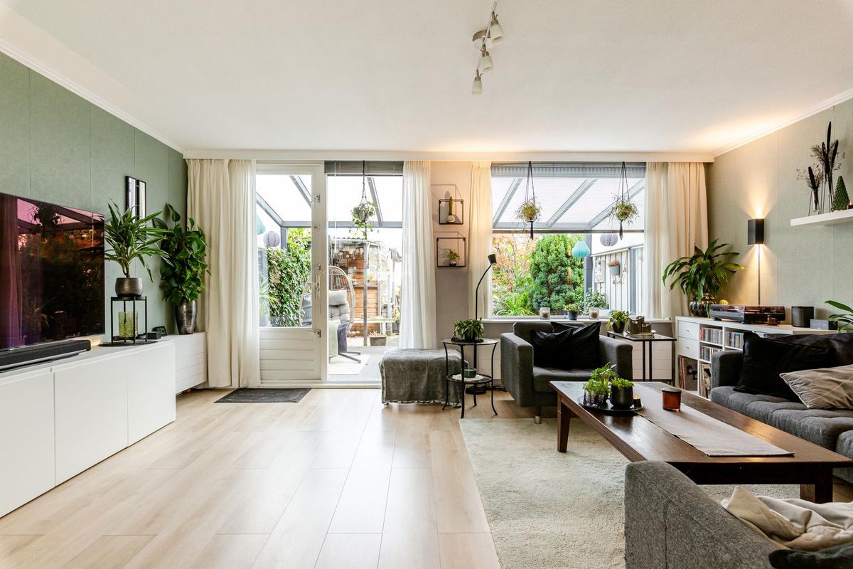 U betreedt de woning via de hal met toilet, meterkast en trapopgang naar de eerste verdieping. De lichte, tuingerichte woonkamer biedt via een schuifpui toegang tot de fraai aangelegde achtertuin met een ruime overkapping direct aan de woning, perfect om het hele jaar door buiten te genieten.