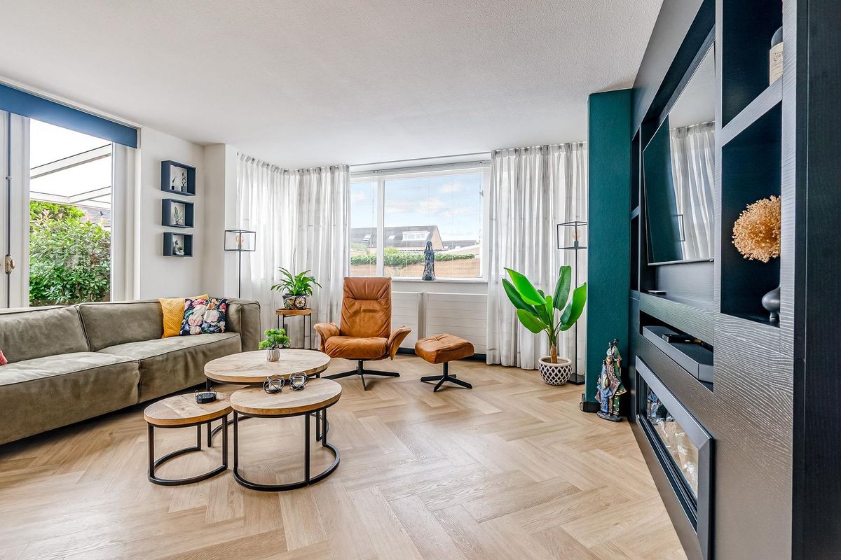 Entree/hal met meterkast, trapopgang, trapkast en vernieuwde toiletruimte (2024). Ruime, lichte woonkamer van ca. 46 m² met erker aan de zijkant en toegang tot de overkapping in de achtertuin (25 m²). Aan de voorzijde bevindt zich de keuken in een U-opstelling, die in 2021 is gerenoveerd en voorzien is van diverse inbouwapparatuur.