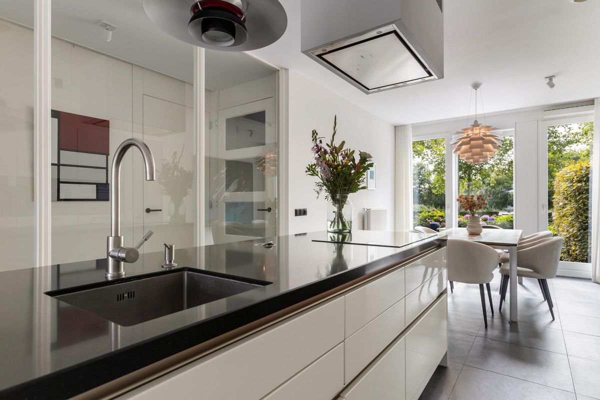 De royale en lichte woonkamer van 44 m² is prachtig afgewerkt en voorzien van een open keuken met moderne inbouwapparatuur. Dankzij de grote raampartijen valt veel daglicht binnen en via de openslaande deuren bereik je de achtertuin. De keuken grenst aan de voortuin, zodat je ook hier een fijn uitzicht hebt.