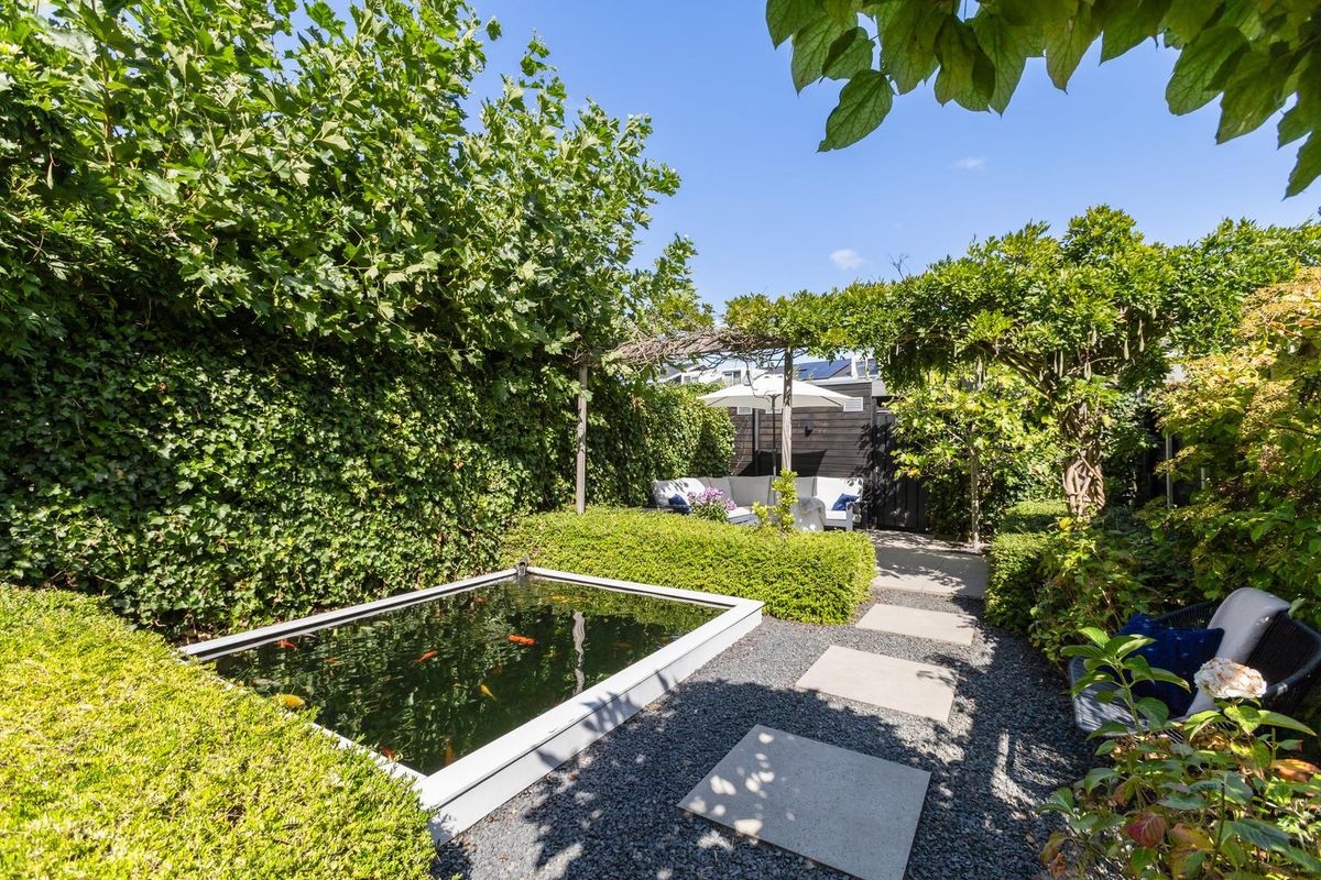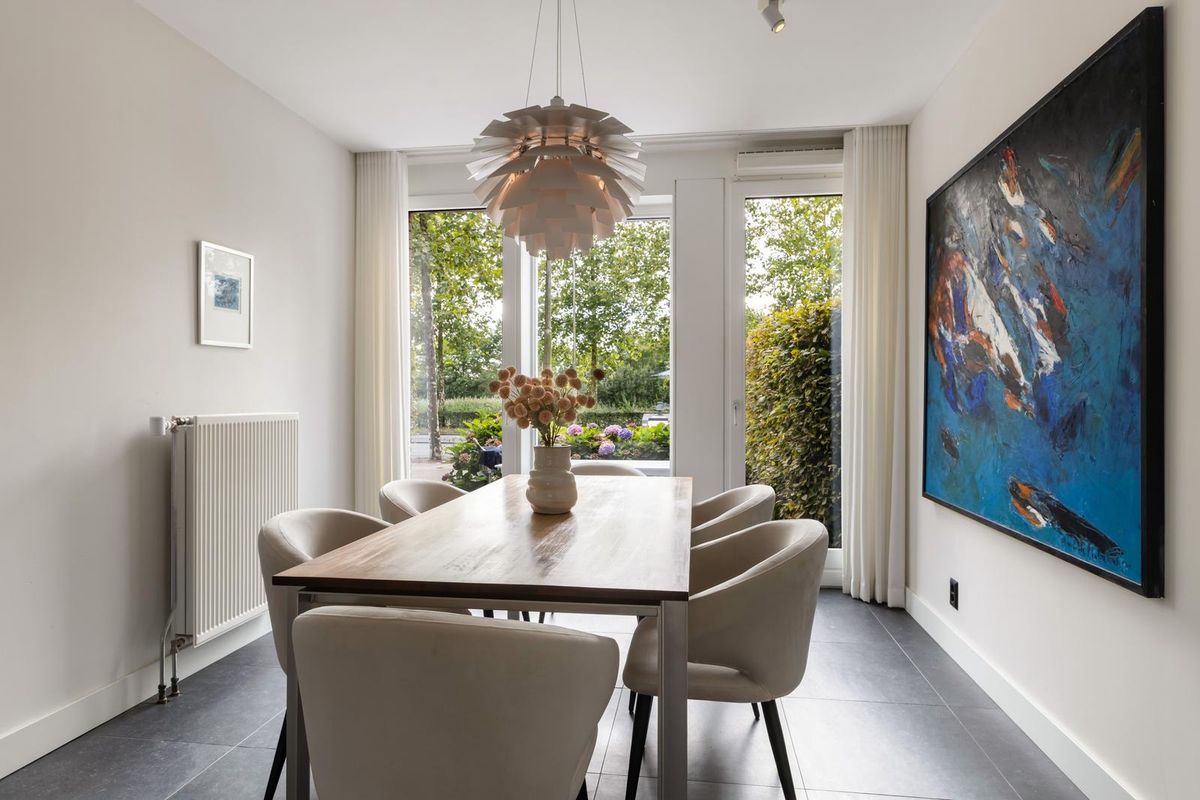 Via de verzorgde voortuin stap je de woning binnen. In de ruime hal vind je de meterkast, garderobe en een modern toilet met fontein. De lichte, tuingerichte woonkamer (ca. 44 m²) heeft grote ramen en openslaande deuren naar de achtertuin, waardoor binnen en buiten mooi in elkaar overlopen. Aan de voorzijde ligt de luxe open keuken met inbouwapparatuur, veel kastruimte en een prettig werkblad. Hier heb je ook direct toegang tot de voortuin.