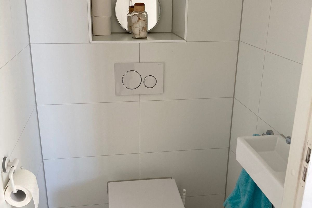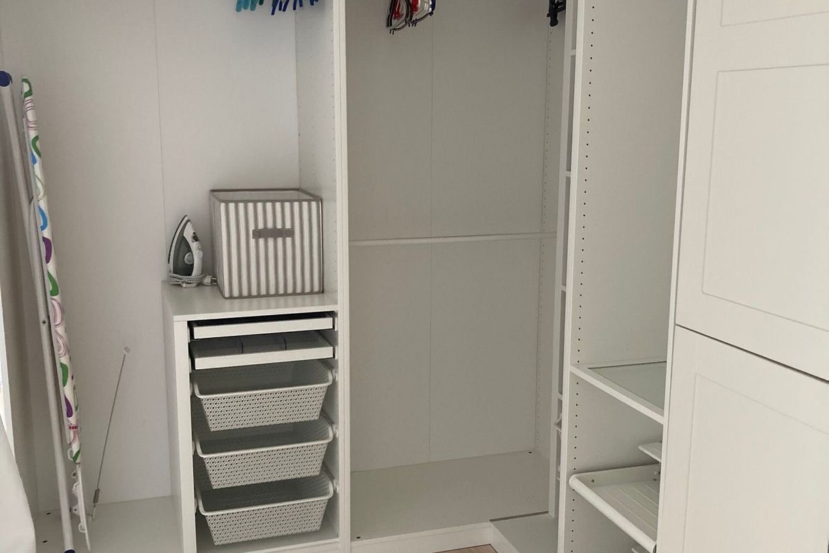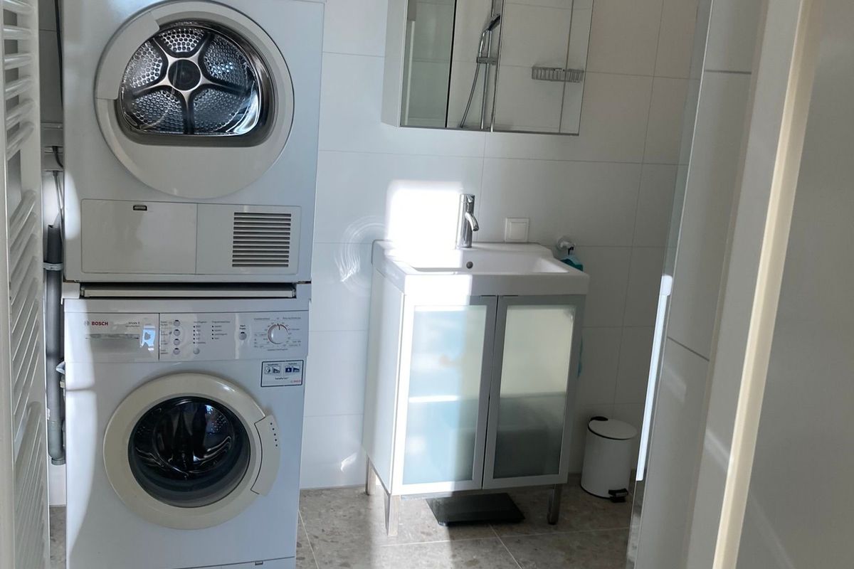 The spacious bedroom, again with beautiful views, features a corner wardrobe setup (walk-in closet) with ample storage space for clothing/shoes and a double bed, plus access to the recently renovated bathroom with a large walk-in shower, washbasin with mirrored cabinet, additional cupboard space, and washer/dryer.
