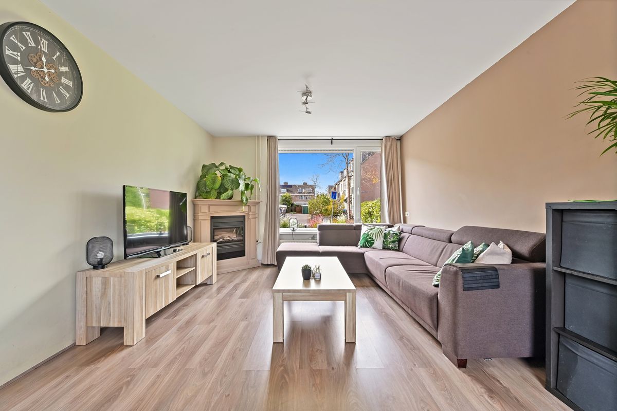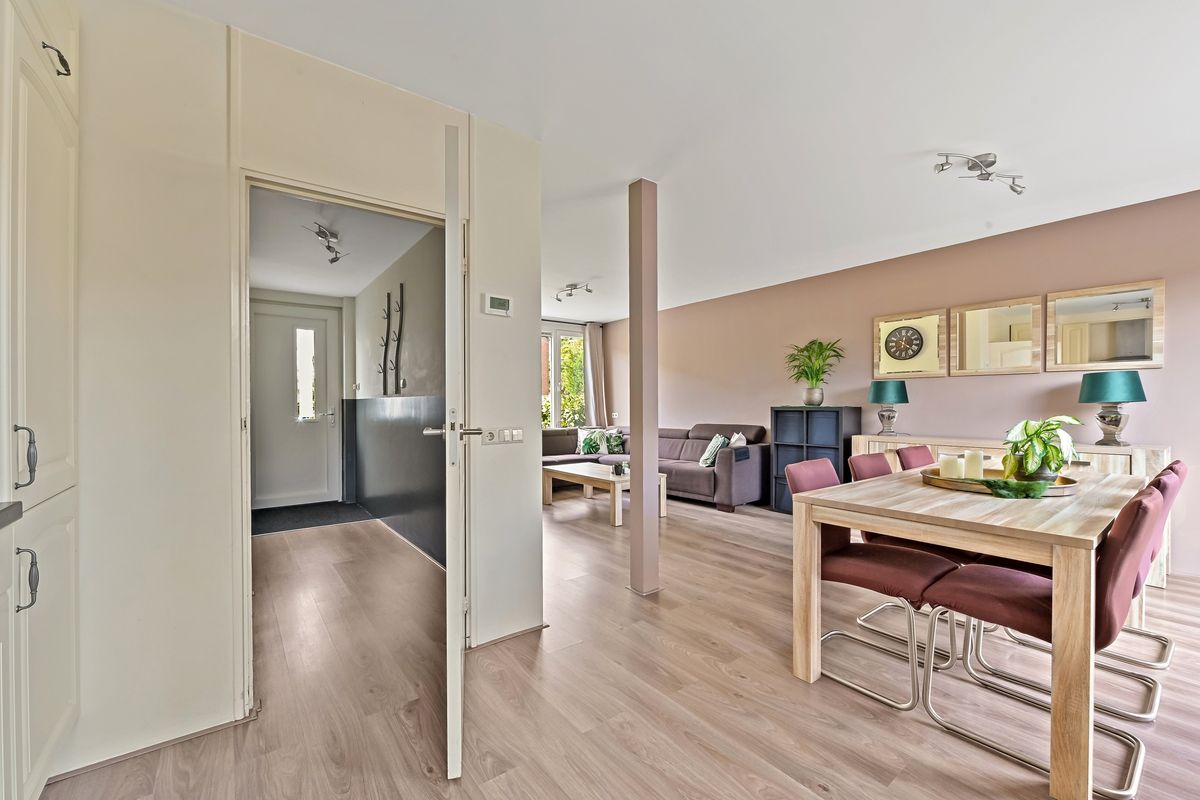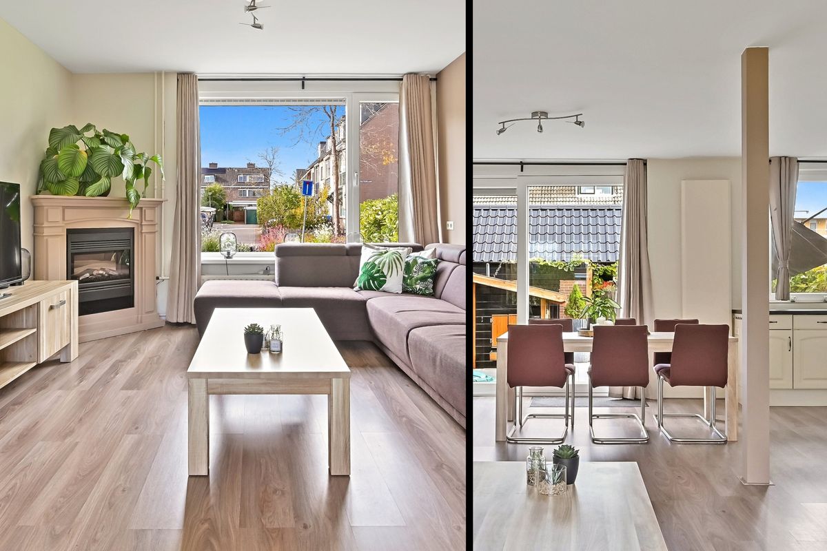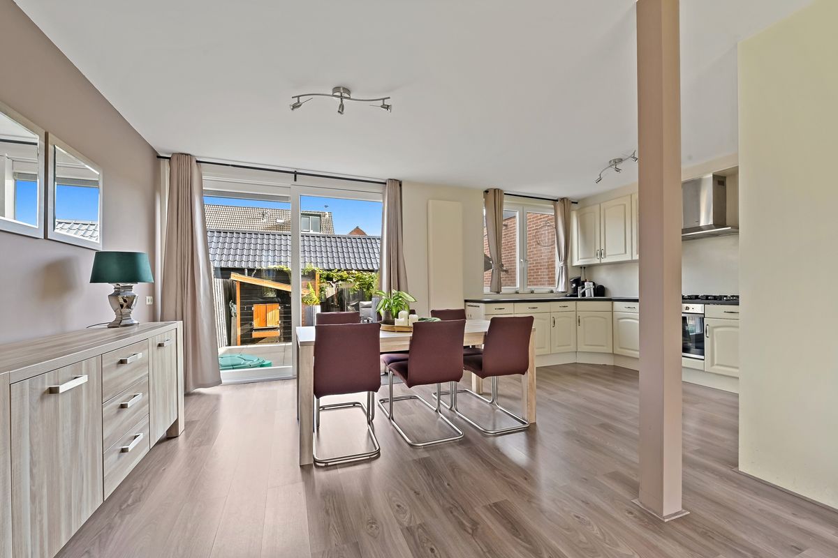 Woonkamer met aan de voorzijde het zitgedeelte en aan de achterzijde het eetgedeelte, aansluitend de keuken. Deze is voorzien van 5 pits gasfornuis, koel-vriescombinatie, vaatwasser en oven. De grote raampartij zorgt voor veel licht, de schuifpui geeft toegang tot de achtertuin met berging, achterom en overkapping met entresol voor extra bergruimte.